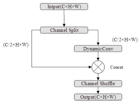 The SR_Dynamic module (Figure 3) further enriches feature interaction by combining channel shuffle with dynamic convolution. It begins by splitting the input feature map X into two groups of channels: . The first group bypasses dynamic processing (residual connection), while the second group undergoes a multi-expert dynamic convolution similar to Equations (1) and (2). Specifically, is enhanced by