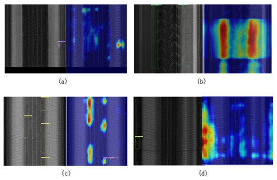 For qualitative analysis, we visualize the detection results of four representative defect samples in Figure 5. Subfigures (a)–(d) correspond to (a) a folded steel belt, (b) overlapping steel belts, (c) an air bubble, and (d) overlapping carcass plies. The results indicate certain limitations in detection performance: samples (a), (c), and (d) were completely missed by the model, while in (b), the defect was only partially detected. The corresponding heatmaps reveal that the model either failed to activate in relevant regions or generated insufficiently salient responses, particularly in complex structural areas. This suggests that further improvements are required to enhance the model’s sensitivity to subtle or structurally complex defects.