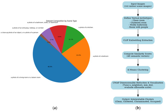 To classify indoor scenes based on their semantic and contamination characteristics, we developed a novel approach termed CLIP-Guided Clustering. This construction leverages foundational research in visual language models, indoor scene classification, and semantic segmentation [18,19,20]. Specifically, the proposed CLIP-guided clustering framework is designed to advance this field by effectively extracting and highlighting archetype-based semantic similarities. Unlike conventional clustering approaches that rely on raw image embeddings, this method uses similarity scores between images and pre-defined textual archetypes as feature vectors. This approach provides interpretable semantic representations and allows clustering to focus on attributes relevant to cleaning and human safety.