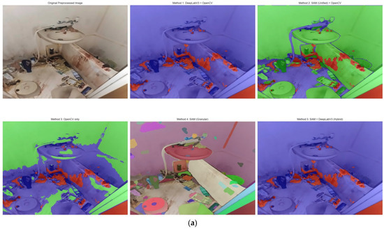 In contrast to these traditional methods—which tend to degrade in cluttered or low-light environments—our hybrid segmentation approach demonstrates greater robustness by leveraging semantic priors from vision–language models and edge consistency from SAM-based structural cues. This combination enables more stable and context-aware region extraction, even under challenging visual conditions, thereby validating the effectiveness of integrating semantic and geometric information in indoor scene analysis.