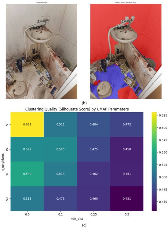 Figure 3. Clustering parameters by UMAP. (a) Comparative examples of floor segmentation using OpenCV, SAM, and DeepLab. (b) Resulting semantic map. (c) Evaluation of clustering quality across UMAP parameter settings. (d) Visualization of the final clustering outcome.