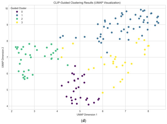 Through systematic evaluation, including UMAP parameter tuning with silhouette score optimization, we confirmed that the obtained clusters were not only interpretable but also objectively validated. The analysis demonstrated that appropriate parameter selection (e.g., n_neighbors = 5, min_dist = 0.0) is critical to achieving robust and well-separated clusters, underscoring the methodological rigor of our approach. Furthermore, quantitative evaluation revealed that the proposed CLIP-Guided Clustering method outperformed the conventional CLIP embedding baseline, achieving the highest average silhouette score across all tested configurations. This improvement demonstrates that incorporating archetype-based semantic similarity leads to more coherent and meaningful cluster formation than relying on raw visual embeddings alone. In addition to improved clustering performance, the proposed approach offers a clear advantage in interpretability. Because each cluster is characterized by explicit textual archetypes (e.g., “cluttered room” or “moldy bathroom”), the resulting groupings can be intuitively understood in terms of environmental quality and cleaning context. This interpretable structure enables both researchers and practitioners to associate visual patterns with actionable cleaning or maintenance strategies. These findings provide reinforced quantitative evidence of the robustness and novelty of the proposed method. By uniting vision–language representations with clustering optimization, CLIP-Guided Clustering establishes a semantically grounded and empirically validated framework for indoor scene understanding.