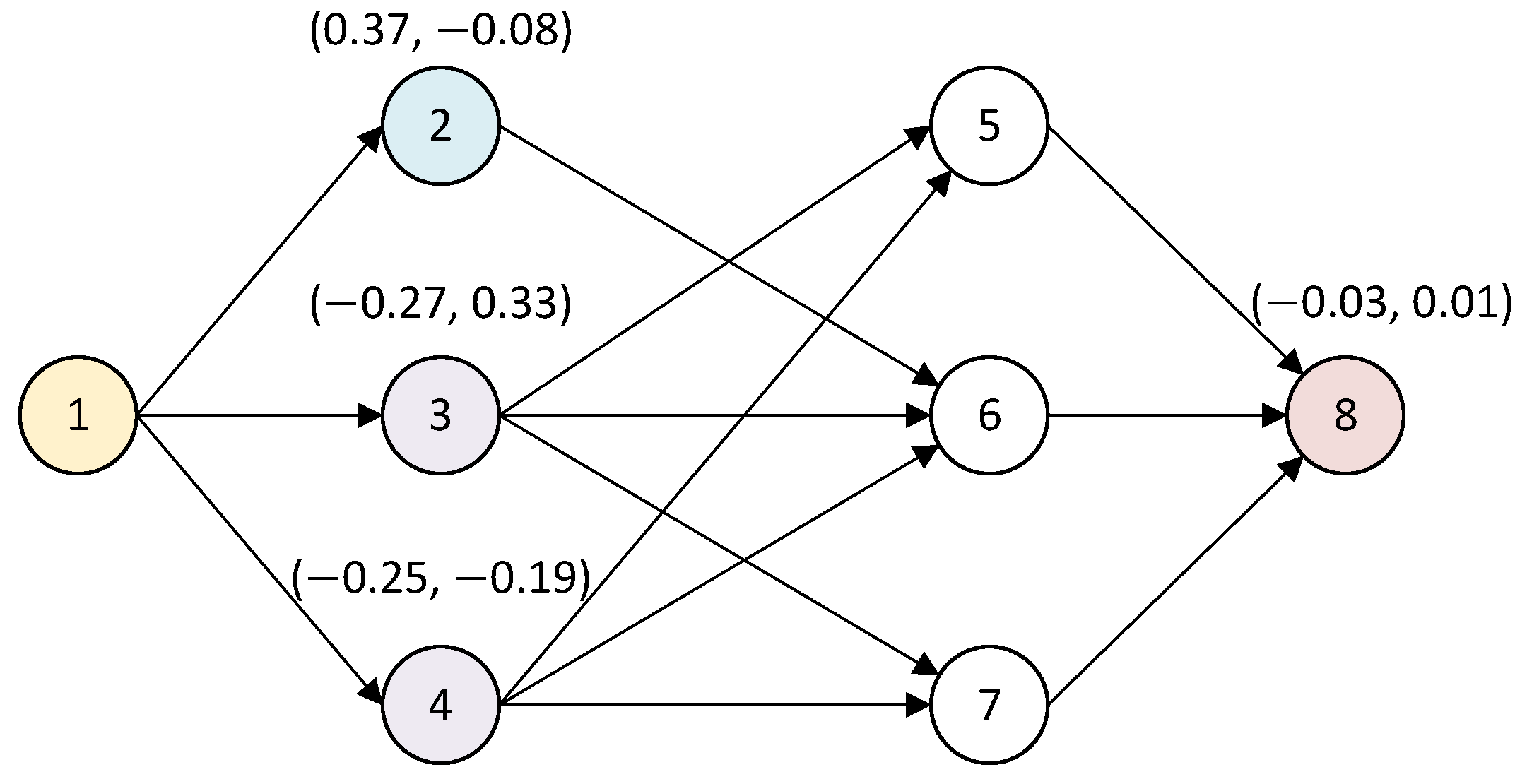 Figure 1 provides a concrete illustration of this node filtering mechanism using graph embedding results. In this scenario, the objective is to find a path from Source node 1 to Sink node 8. Prior to pathfinding, we perform graph embedding operations on the RRG. Specifically, the embedding process is based on a random-walk approach, where multiple random walks are conducted on the graph to generate a series of sampled node sequences. These samples are then used to train a neural network to learn dense vector representations for the nodes. The detailed procedure of this graph embedding method is described in Section 2.3. As an example, the obtained vector representations for relevant nodes are as follows: node 2 (0.37, −0.08), node 3 (−0.27, 0.33), node 4 (−0.25, −0.19), and the target node 8 (−0.03, 0.01). For this example, we assume an embedding dimension d = 2 and utilize the DeepWalk [28] algorithm to generate these representations. When the router expands from the current Source node 1, which has three child nodes (2, 3, and 4), we compute the similarity between each child node of Source node 1 and the target Sink node 8, yielding cosine similarity of −0.99, 0.85, and 0.56, respectively. The calculation for cosine similarity is shown in Formula (2). Based on these metrics, node 2 (with strongly negative similarity) is filtered out from further exploration. This strategic filtering eliminates one-third of the candidate nodes while remarkably preserving six-sevenths of the potential paths to the target. This selective filtering significantly increases the probability of finding congestion-free paths by directing the search toward more promising regions of the RRG.