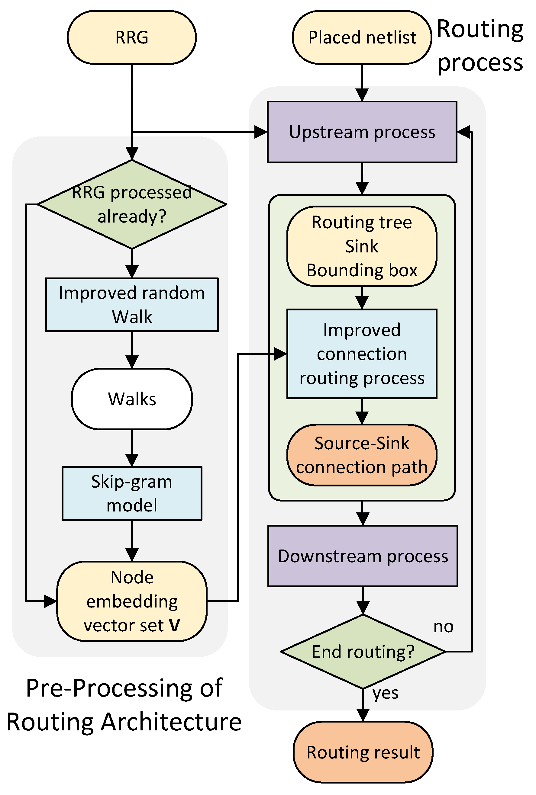 Prior to the initiation of the standard CAD flow, the FPGA routing architecture undergoes a comprehensive preprocessing stage that generates high-quality embedding vectors to guide the subsequent node filtering process during routing. This preprocessing phase utilizes three key parameters: W L (Walk Length) and W N (Walk Number), and V S (Vector Size). Specifically, W L defines the number of nodes included in each random walk sequence starting from a given node, thereby determining the exploration depth of each walk. W N represents the number of random walks initiated from each node, controlling how many independent traversal samples are collected to ensure sufficient coverage of the RRG. V S denotes the dimensionality of the embedding vectors produced by the Skip-gram model, reflecting the representational capacity of the learned embeddings. These parameters collectively control a modified random walk procedure to generate comprehensive and representative walk sequences. As illustrated in Figure 2, our DeepWalk-based methodology follows a systematic two-step approach: first generating representative walk sequences that comprehensively cover the RRG topology through modified random walks, then training a Skip-gram model on these sequences to obtain the final graph embeddings that capture nuanced topological relationships. Importantly, for any given FPGA routing architecture, this complete preprocessing procedure, including both the constrained random walk generation and Skip-gram model training, needs to be executed only once for each RRG, and remains valid independent of changes in the design benchmarks, providing significant computational efficiency across multiple routing tasks.