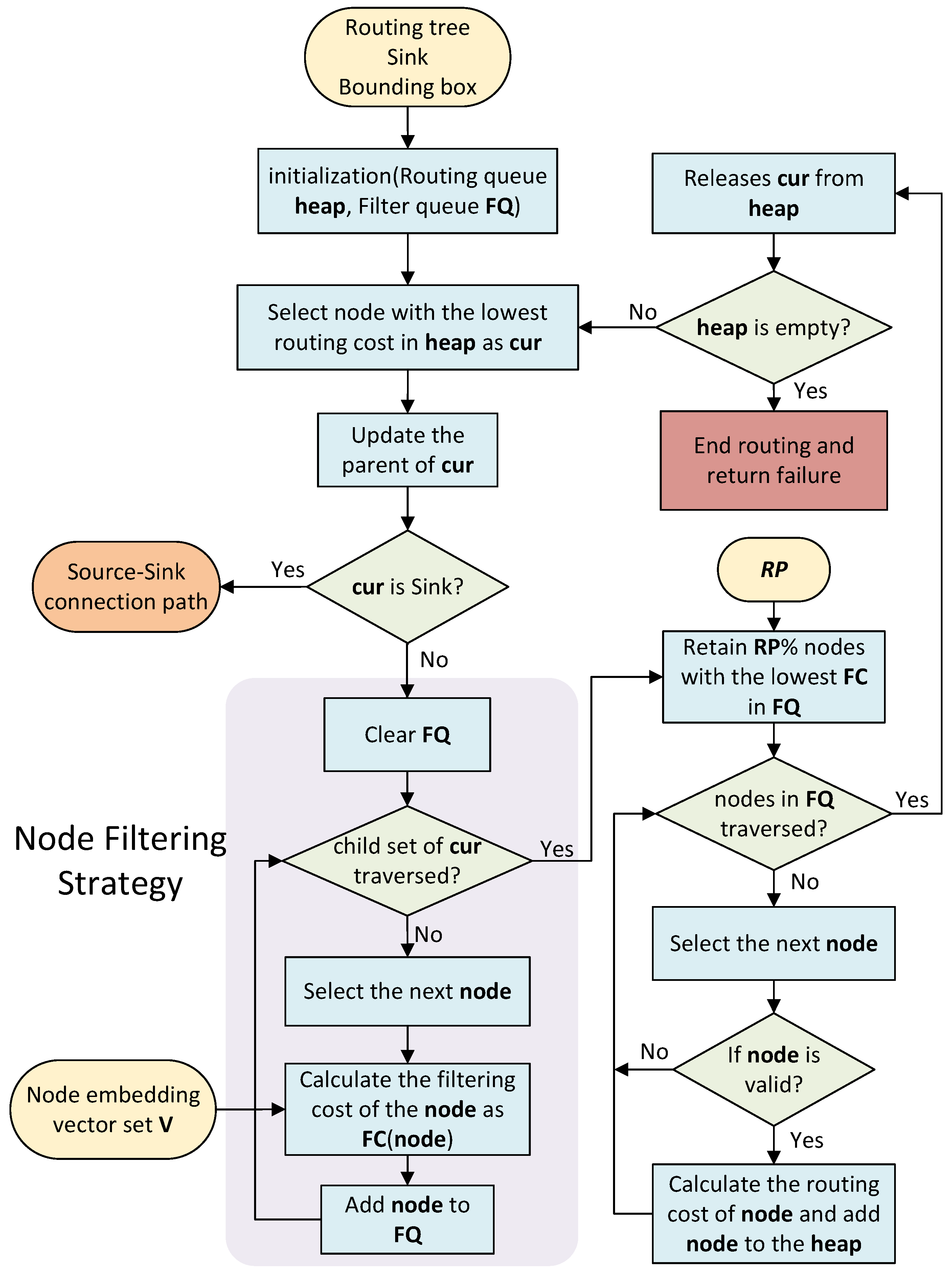 The second stage is the improved connection routing process, which integrates seamlessly into the standard CAD flow. This process leverages the precomputed graph embeddings to intelligently guide the routing process. During the connection establishment between each Source and Sink pair, this enhanced algorithm incorporates a sophisticated node filtering mechanism that utilizes the embedding similarities to filter unpromising search directions while preserving viable paths, thereby significantly accelerating the routing convergence without compromising solution quality.