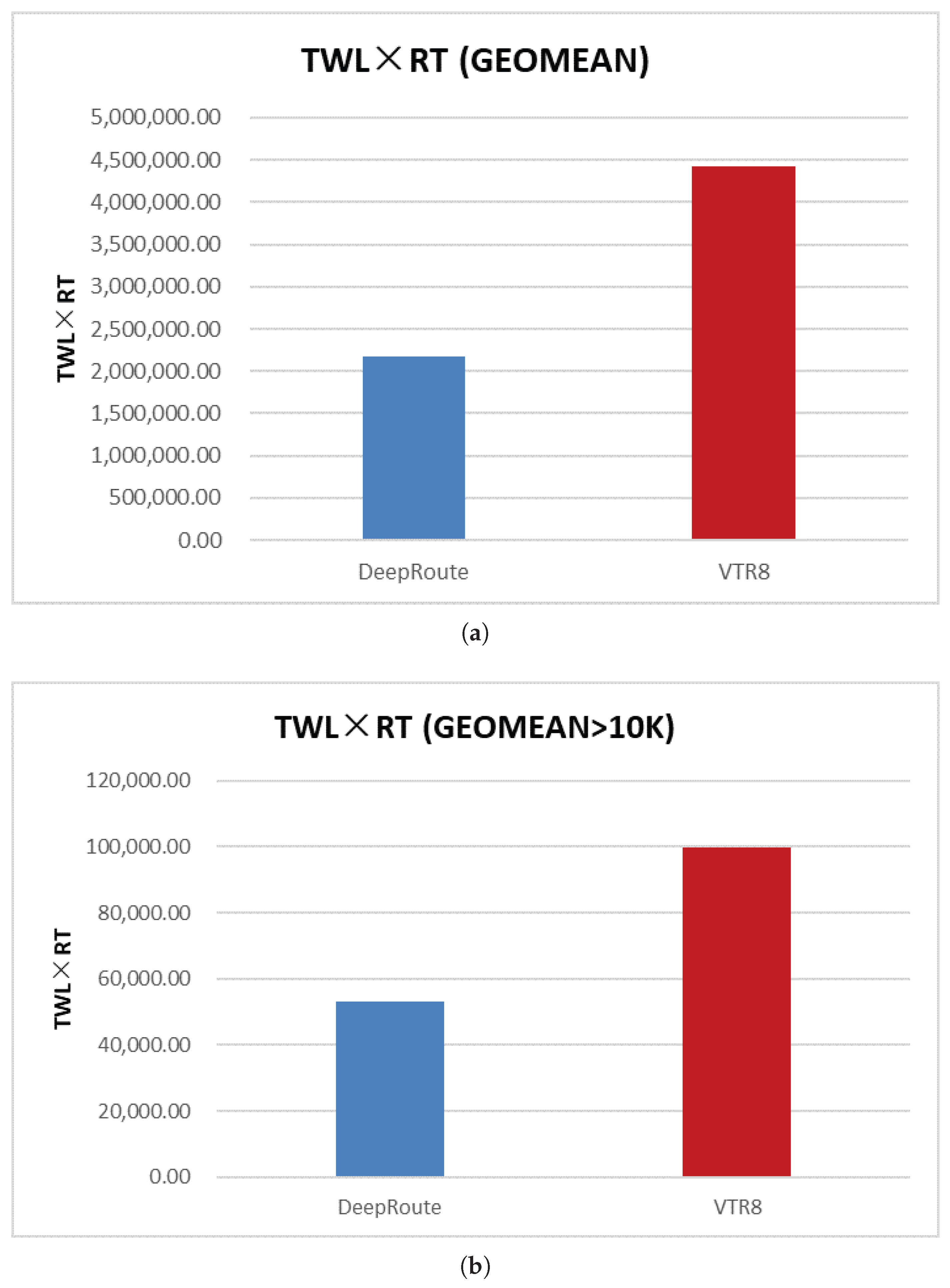 • We conducted extensive experiments using the VTR flagship architecture and benchmark suites [29]. Our results demonstrate that DeepRoute achieves a remarkable 51.31% improvement in routing speed compared to the baseline VTR8 router [29], while maintaining identical critical path delay and limiting total wirelength degradation to within 10%. Furthermore, when compared to FCRoute [20], our method achieves an additional ~10% speedup, with this performance advantage becoming more pronounced on larger circuits where we observe approximately 13% improvement, demonstrating superior scalability.