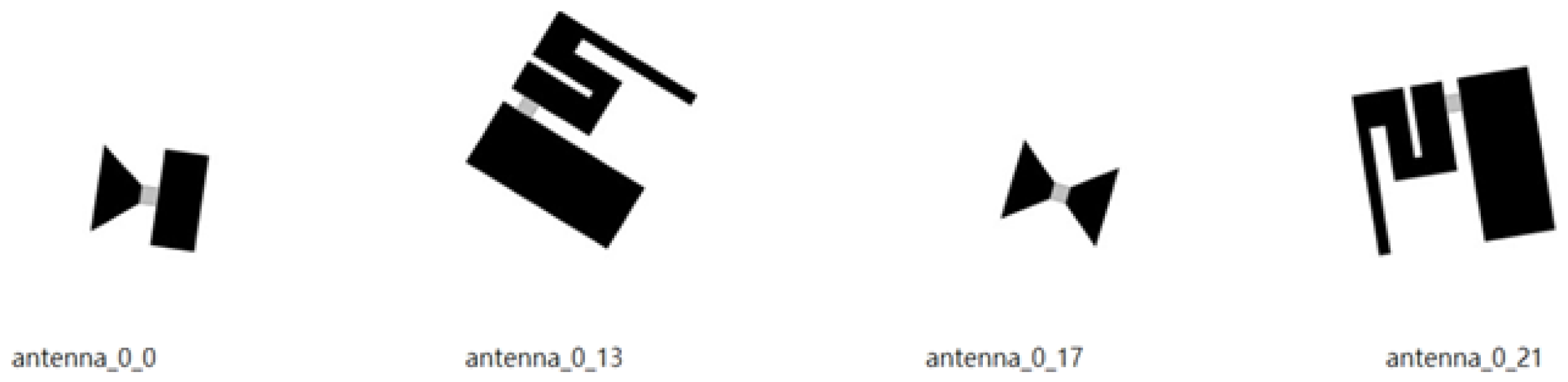 After training the WAG-PGGAN model, a set of promising antenna designs was randomly sampled from the generator. The generated images, each with a resolution of 512 × 512 RGB pixels (PNG format), were mapped to the actual physical antenna dimensions in a 1:1 scale. These images were then post-processed and converted into vector drawings compatible with HFSS, where each design was re-modeled to verify its S11 performance and frequency band alignment.