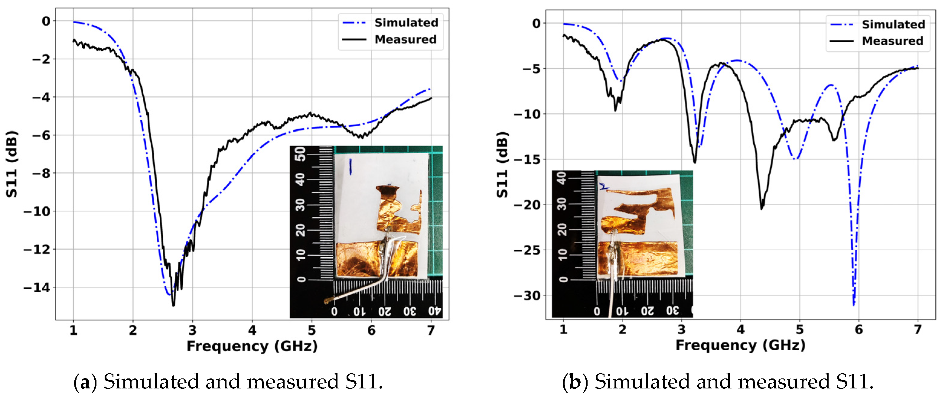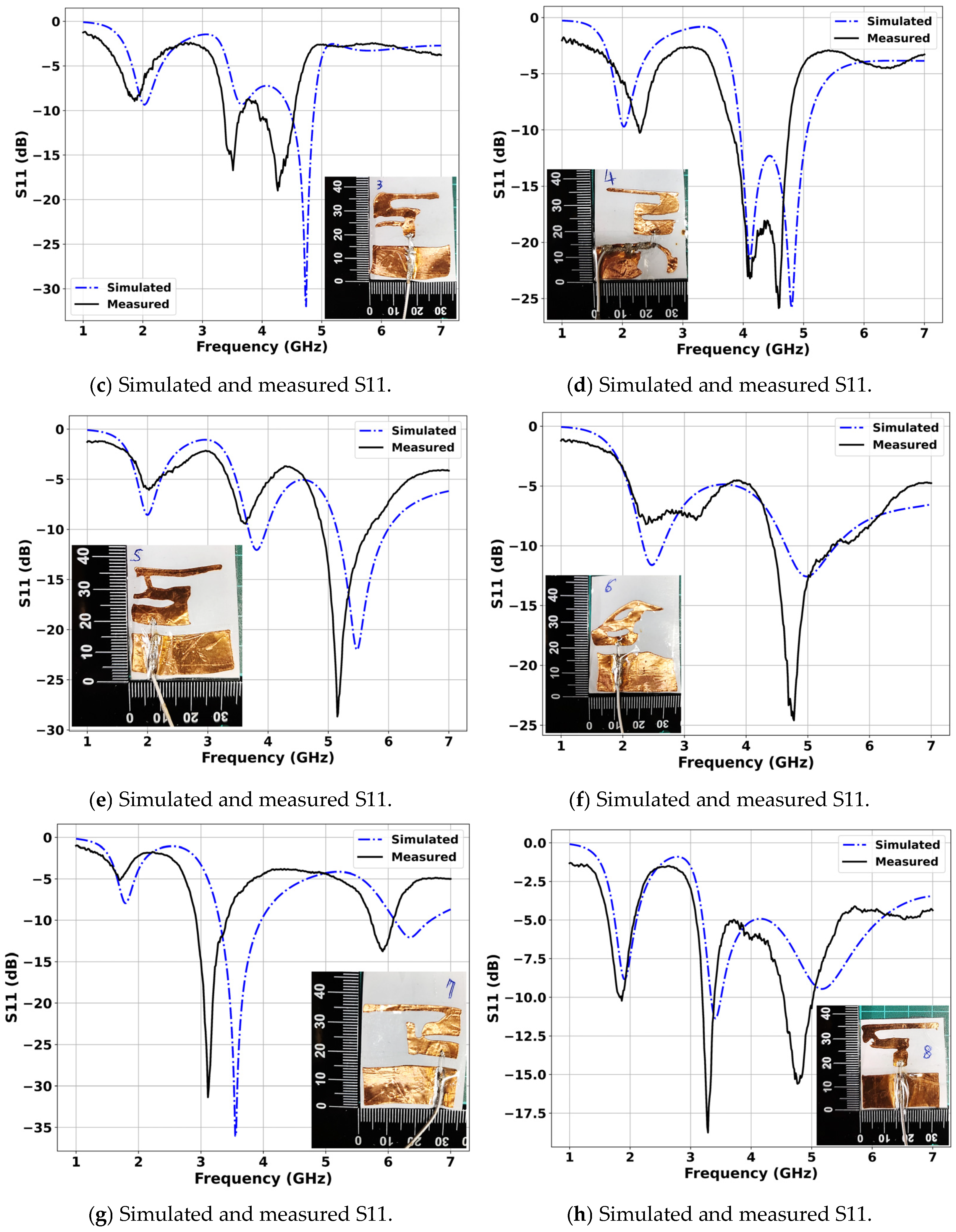 Figure 9, representative multiband antenna structures were selected along with their corresponding HFSS simulations and experimental measurements. The simulated and measured S