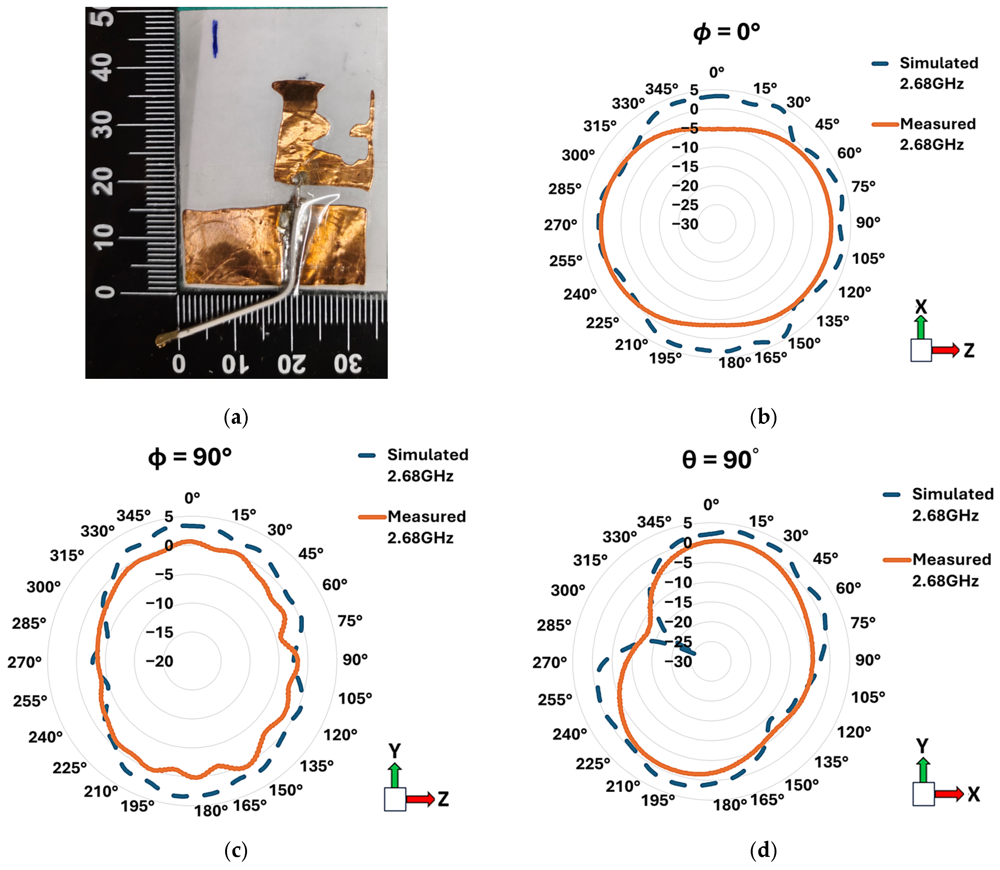 Figure 17 presents the simulated and measured radiation patterns of the Lo-band PIFA-like antenna (Antenna 3) at 1.86 GHz, including three principal planes: ϕ = 0°, ϕ = 90°, and θ = 90°.