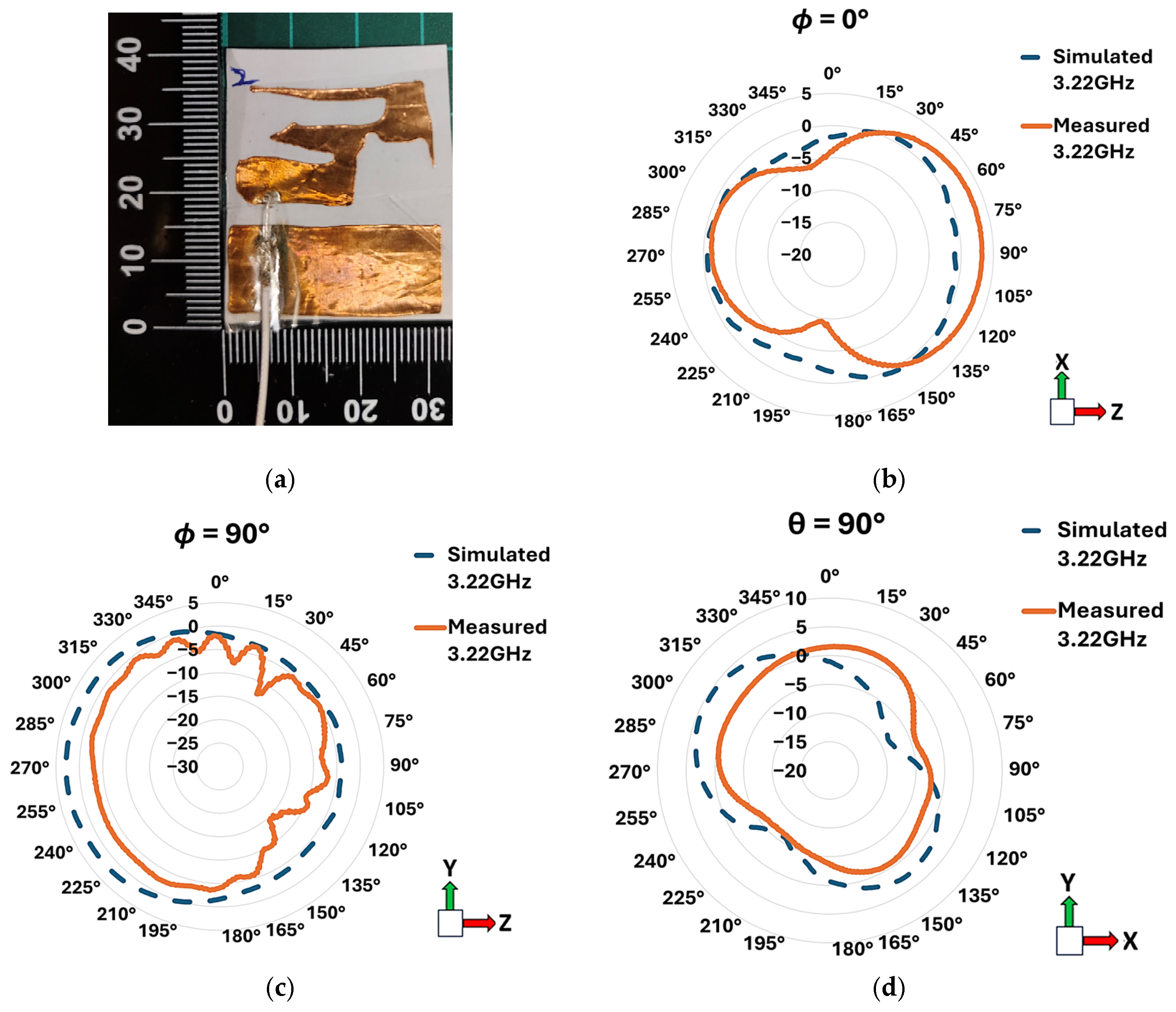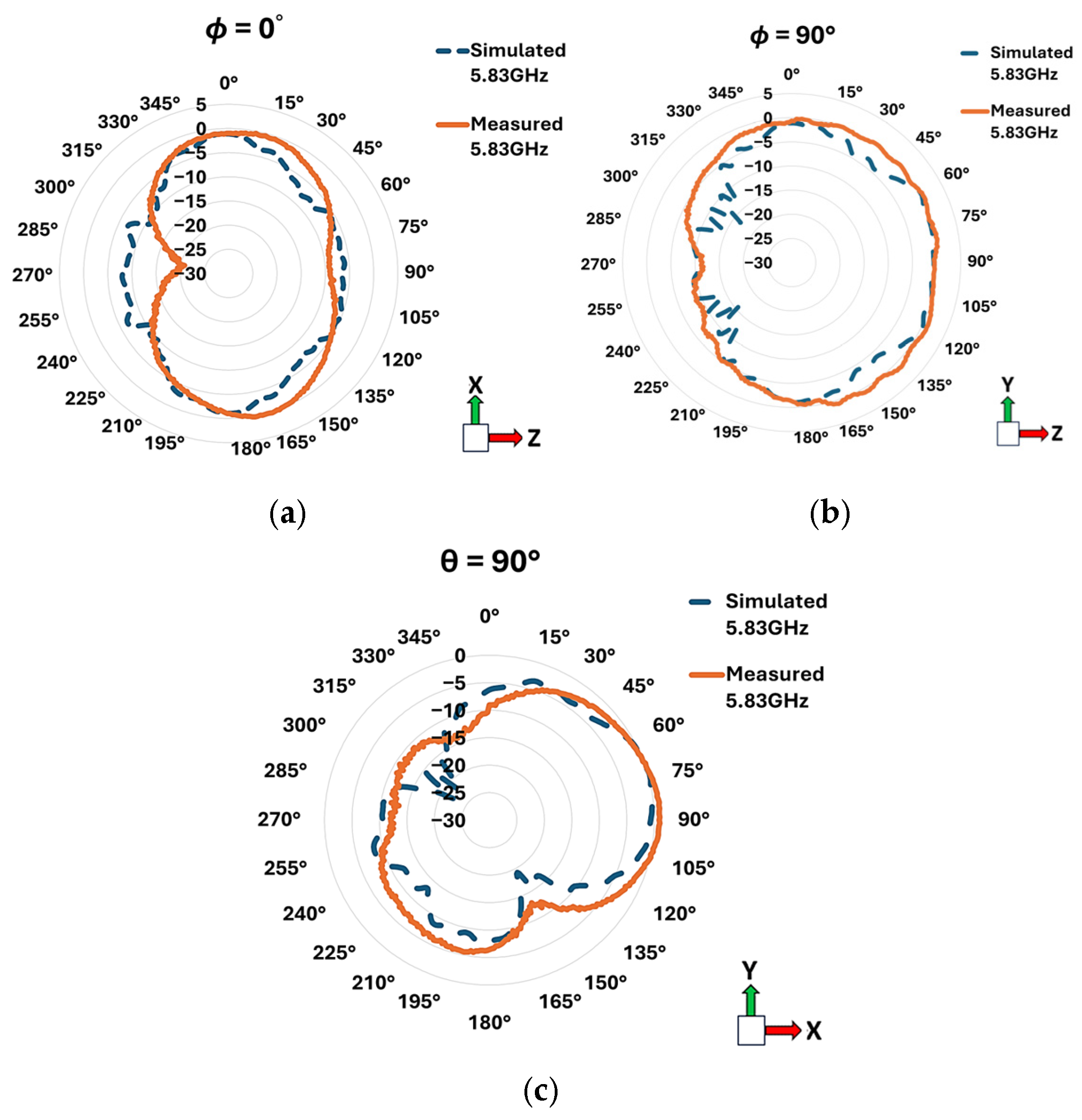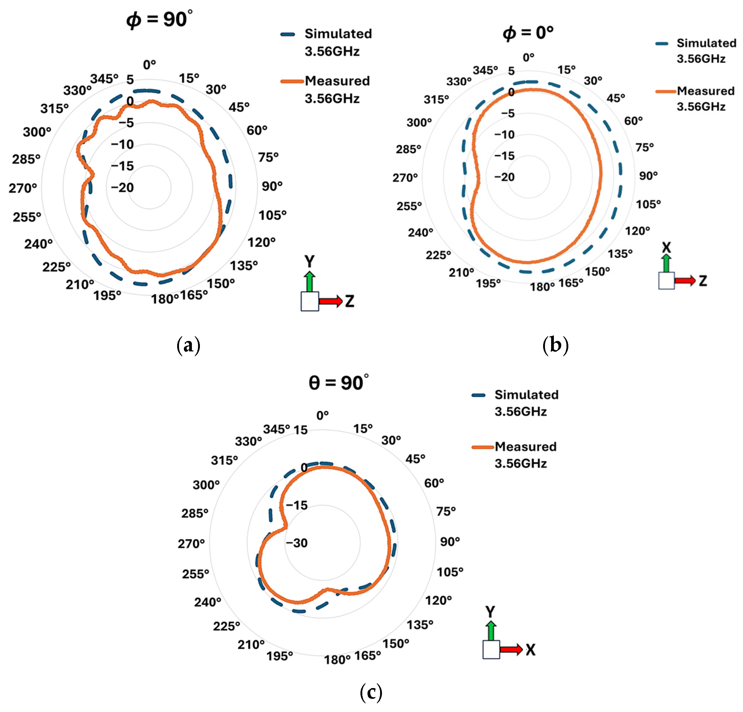 In this plane, the radiation pattern shows mild asymmetry in the measured result, particularly around 120–150°, where a small notch appears. Nonetheless, the overall shape remains stable and correlates well with the simulated result. This confirms adequate directional consistency across azimuthal angles.