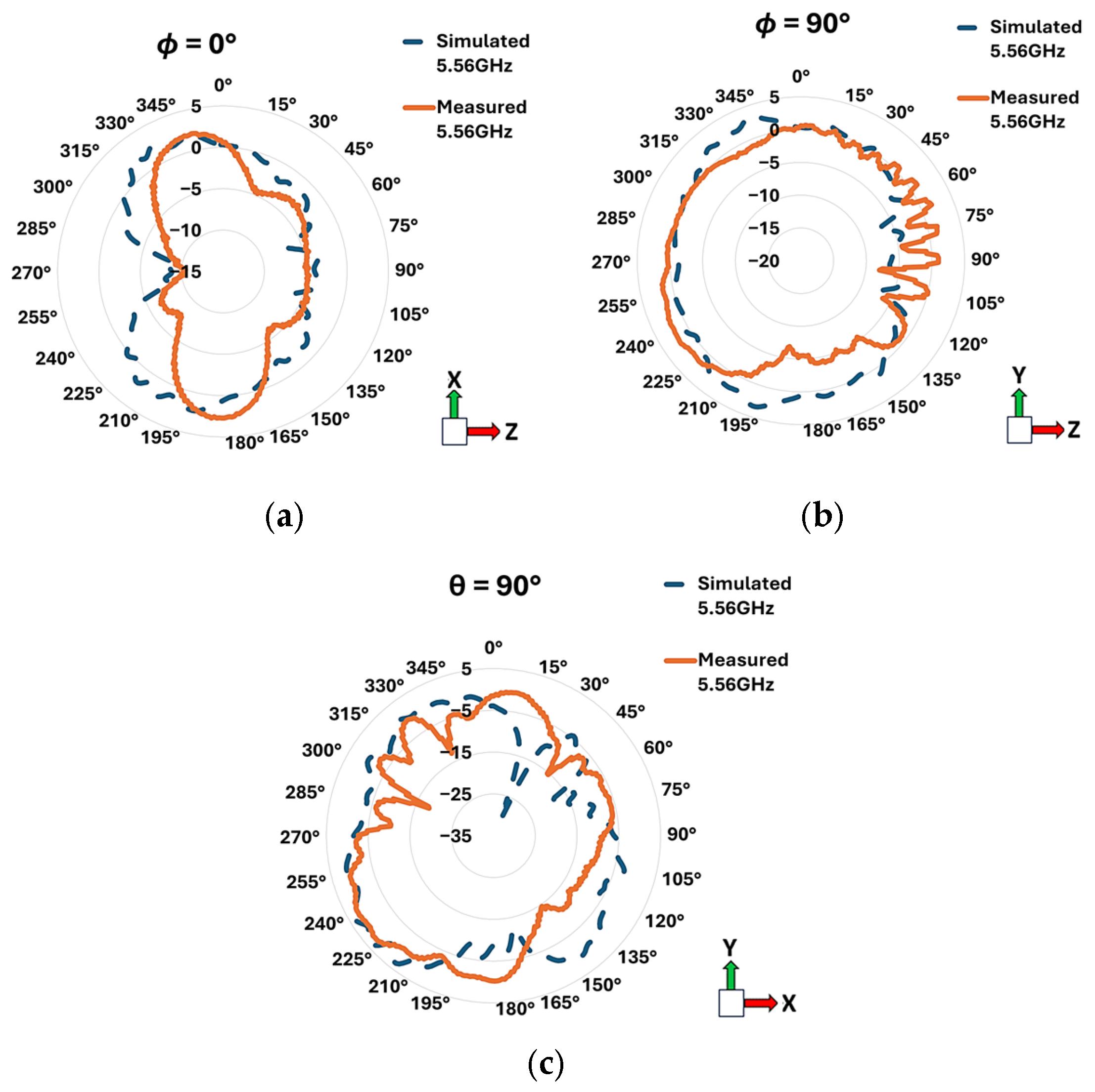Figure 16 shows the radiation patterns of the Hi-band PIFA-like antenna (Antenna 2) at 5.56 GHz, including three principal cuts: ϕ = 0°, ϕ = 90°, and θ = 90°, comparing both simulated and measured results.