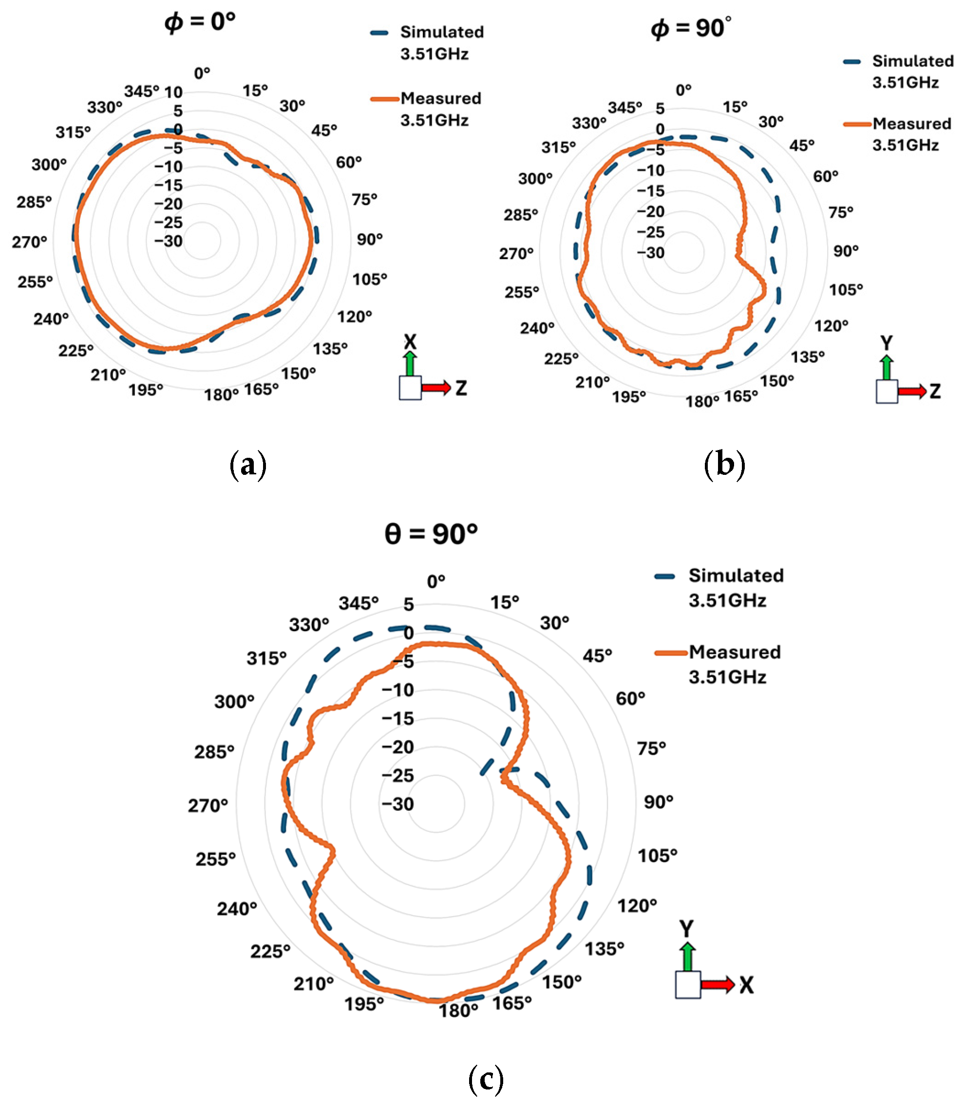 The radiation patterns at 3.51 GHz confirm that Antenna 3 maintains complex directional behavior with angular variation across all principal planes. The measured radiation pattern is adopted as the primary reference for evaluation. The measured radiation efficiency at 3.51 GHz is 69.18%, confirming satisfactory radiation performance.