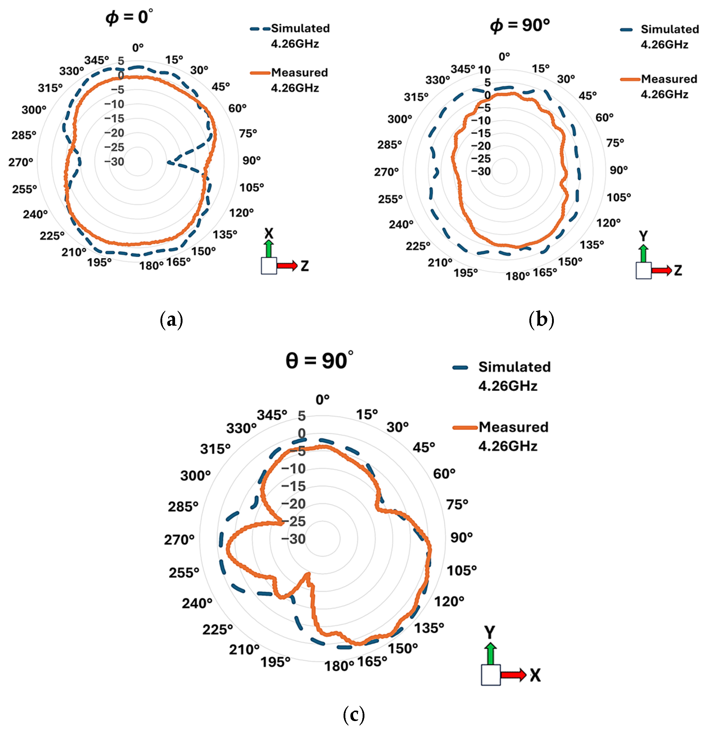 The radiation patterns at 4.26 GHz confirm that Antenna 3 maintains complex directional behavior with angular variation across all principal planes. The measured radiation pattern is adopted as the primary reference for evaluation. The measured radiation efficiency at 4.26 GHz is 52.24%, confirming satisfactory radiation performance.