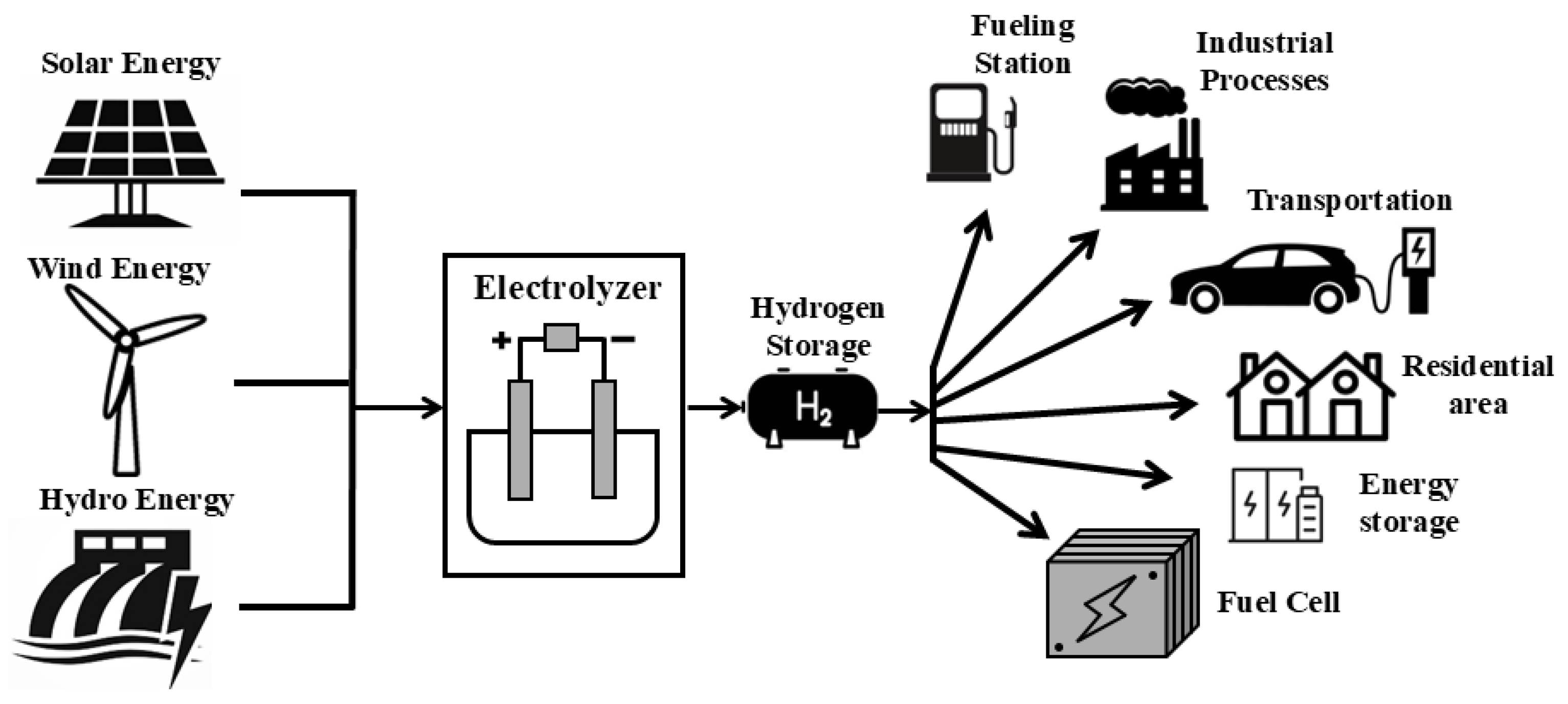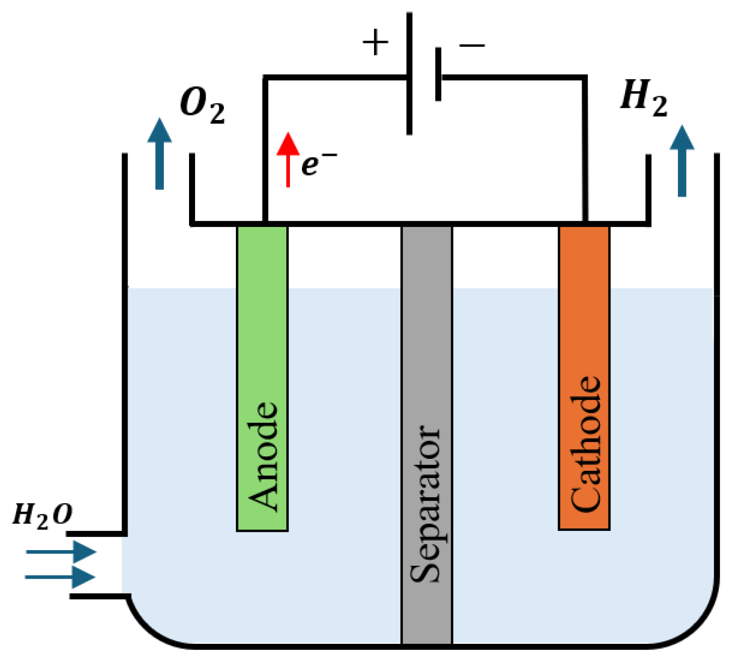 The transition to a hydrogen-based economy, supported by RES, is significantly dependent on electrolysis that transforms green electricity into hydrogen. Electrolysis refers to the method of applying an electric current to dissociate water into hydrogen and oxygen gas, as shown in Figure 2.