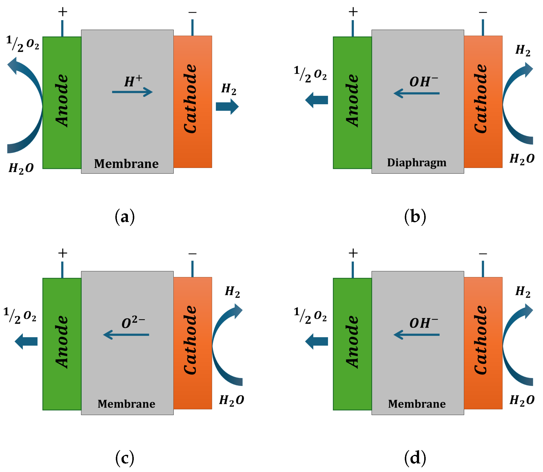 Electrochemical water electrolysis technologies can be classified primarily according to the nature of the electrolyte and the ionic agents transported between electrodes, as illustrated in Figure 3.