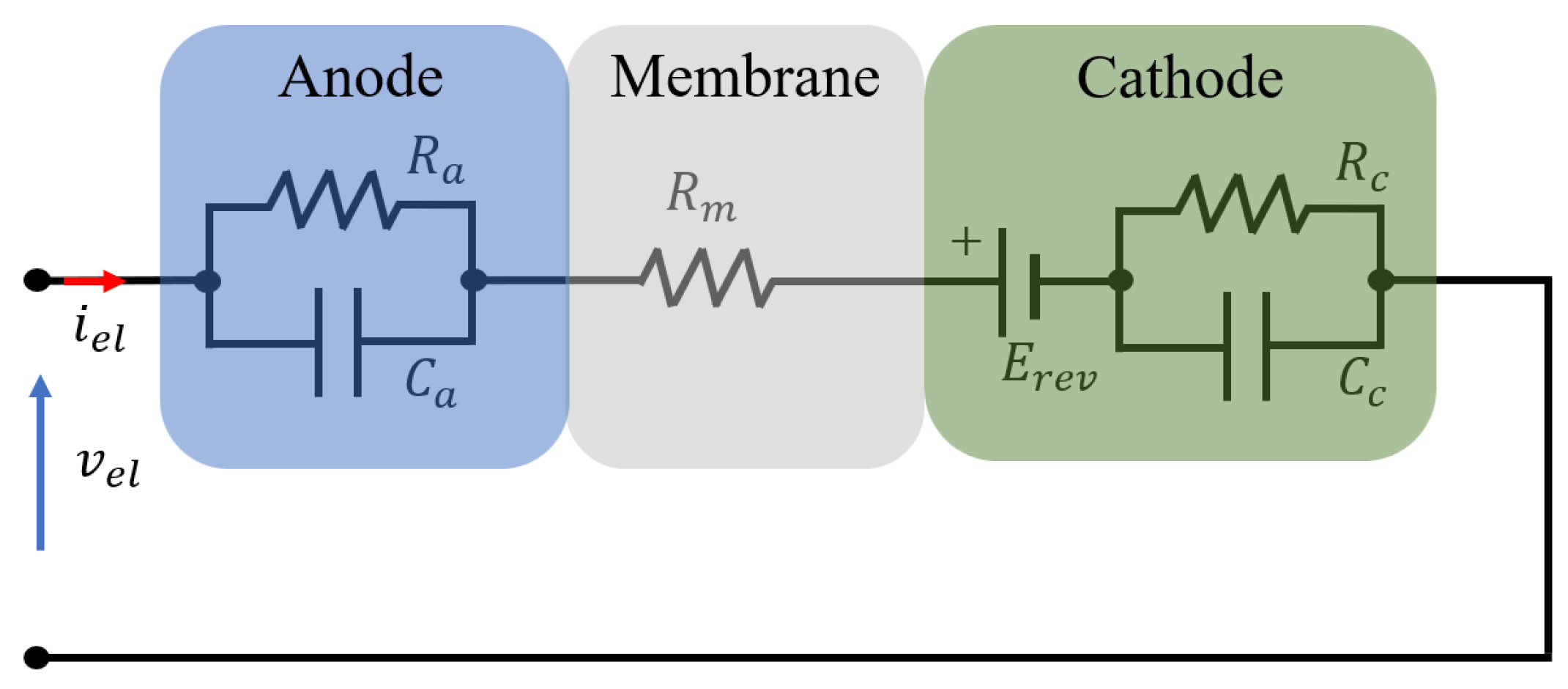 In [20,21], the dynamic behavior of PEMELs was investigated by developing an equivalent electrical circuit (EEC) model. Specifically, in [21], Guilbert and Vitale addressed the limitations of steady-state models by introducing capacitive effects into the EEC framework. In contrast, in [20], Yodwong et al. proposed a model validated against a 400 W commercial PEMEL designed for the testing of DC-DC converters and control systems. For emulator validation, a PEMEL emulator using a DC-DC boost converter has been successfully implemented in [56,57,58,59], along with a comparative analysis of data from a real PEMEL using the power-hardware-in-loop (PHIL) system. A high-power (405 A) PHIL simulator was presented in [58,59], allowing accurate analysis under real conditions. Furthermore, in [57], Zhou and Francois created a control-oriented model for hydrogen production within a hybrid system. Moreover, the model in [56] accurately replicates the nonlinear polarization curve, eliminating the need for complex auxiliary systems. An analog EEC based on a Maxwell derived from electrochemical impedance spectroscopy (EIS) data from a commercial reversible solid oxide electrolyzer cell (RSOEC) stack was developed in [60]. A PHIL-based load emulator was developed to replicate the electrical behavior of an AWE EL using an EEC model, allowing rectifier testing [61].