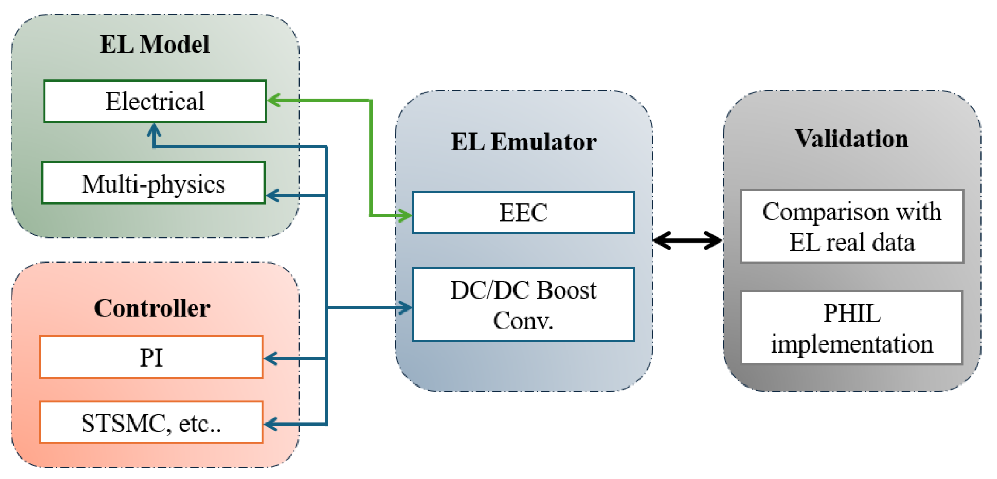 However, experimental hardware is ignored when only simulation is used, even though this hardware is important for studying the EL behavior in a complete system or when integrated into the microgrid. Hardware that is capable of accurately imitating the EL behavior is essential for allowing experiments to be conducted under controllable conditions, offering advantages such as repeatable tests, performance validation, and a realistic representation of system behavior without the use of a real unit, at least during the initial experimental stages. In this regard, this hardware system is known as an emulator [23]. An emulator can take the place of a real EL, allowing for study and examination. After performance validation, it can be replaced with a real EL, helping to save time and money while avoiding the risk of damaging the real one. An emulator is a combination of hardware and software designed to mimic the behavior of a real system. It provides a trade-off between precision and speed, offering a practical alternative [24], since it utilizes a component-based architecture, thus improving scalability and adaptability for various applications. An emulator is a physical or digital system designed to reproduce the input–output behavior of any device in real-time. Unlike a purely mathematical model, which provides a theoretical or computational description of system dynamics, an emulator allows for experimental validation, controller testing, and hardware-in-the-loop (HIL) studies by interacting directly with power electronics and control hardware.