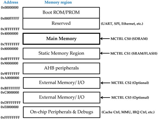 The MCTRL plays a crucial role in LEON3’s memory organization by mapping external memories into specific address regions, as illustrated in Figure 1. Its configuration enables flexible partitioning of system memory across chip-select (CS) regions. Of particular importance in this work is the main memory region (SDRAM mapped to CS0), which spans the address range 0x40000000 to 0x7FFFFFFF. This region typically hosts program data, heap, and stack segments during benchmark execution. As such, it contains the majority of runtime variables that are directly exposed to soft errors, including state arrays, intermediate matrices, and key data structures. The SDRAM represents the most fault-prone component due to its dynamic cell architecture, high density, and reduced critical charge in modern process technologies.