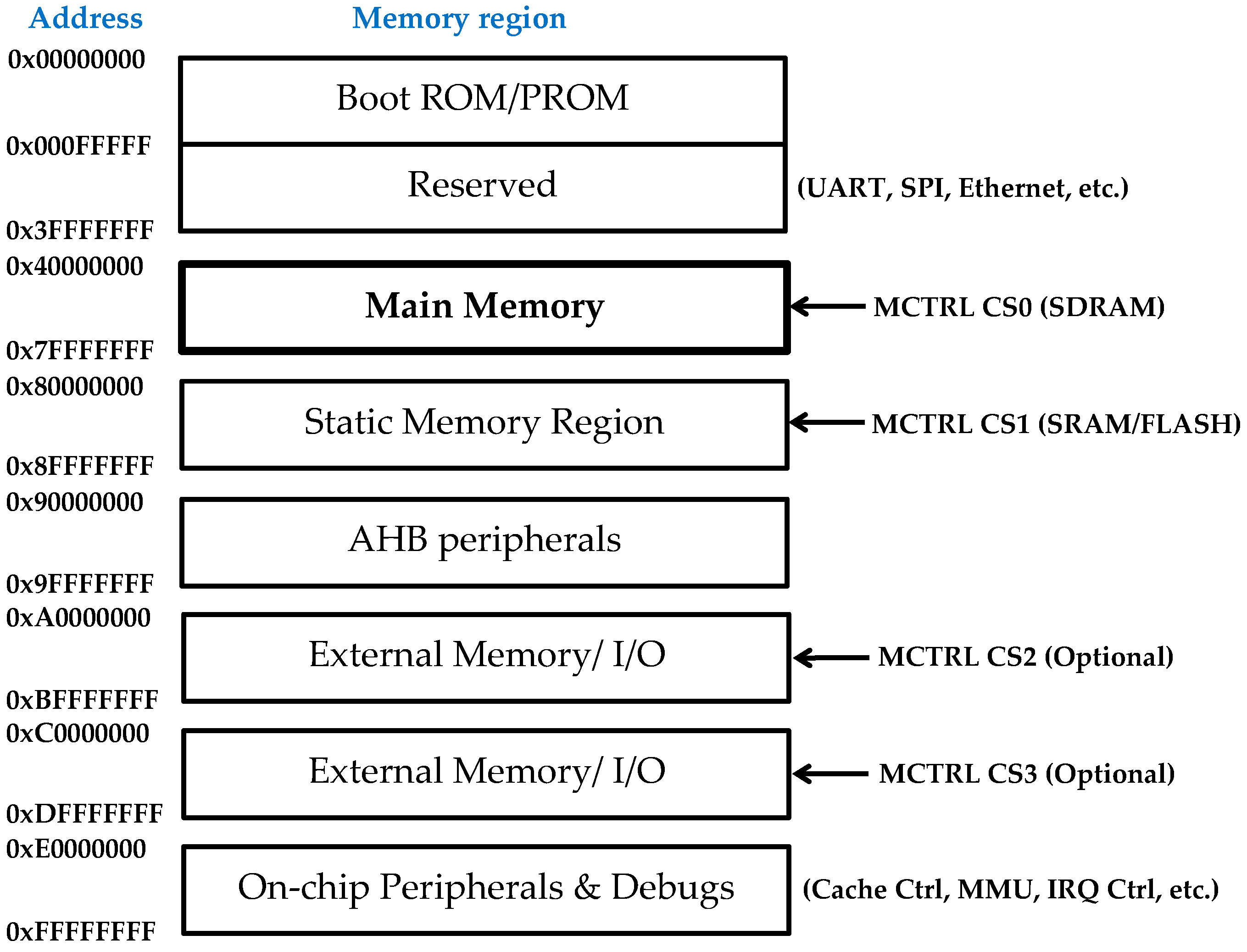 • External memory subsystem, managed by the LEON3 memory controller (MCTRL), which supports several memory devices such as SRAM, PROM, and SDRAM.