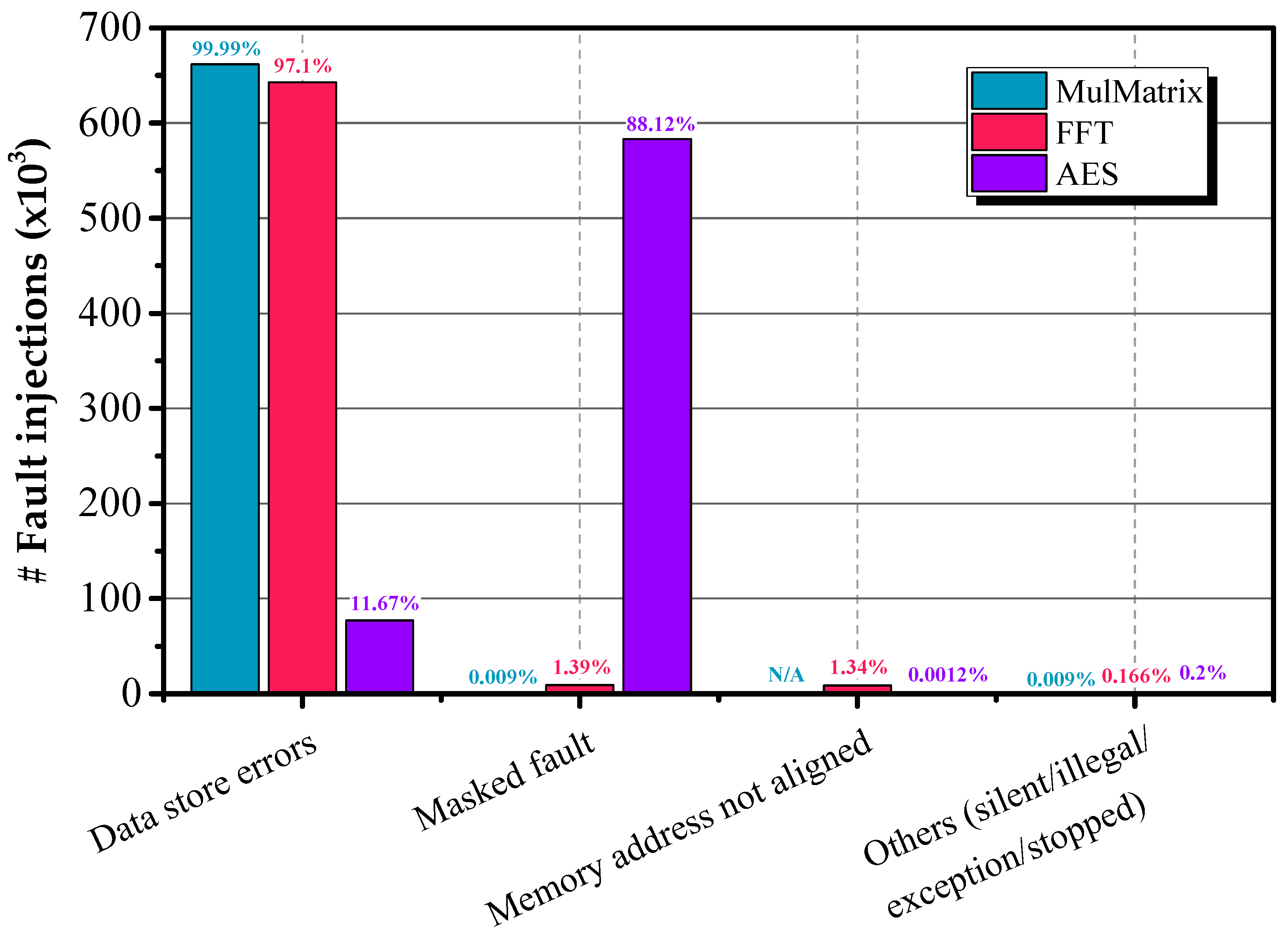 • Total injection events: The experiments comprised 661,870 injections for MulMatrix, 662,870 for FFT, and 661,888 for AES, ensuring comprehensive coverage of the active memory footprint under each workload.