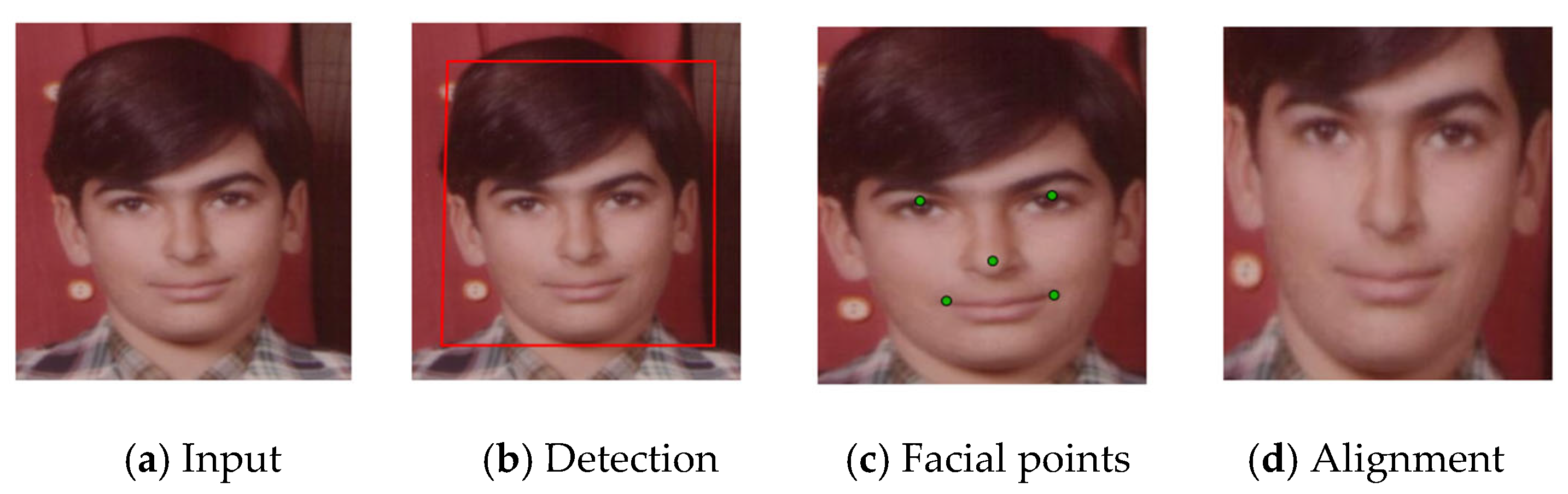 Figure 2, consisted of detection, alignment, cropping, and normalization. First, detect the facial region and five key landmark points: the centers of the left and right eyes, the tip of the nose, and the left and right corners of the mouth. The face then aligned to an upright pose based on these landmarks, and the central facial region cropped and normalized.