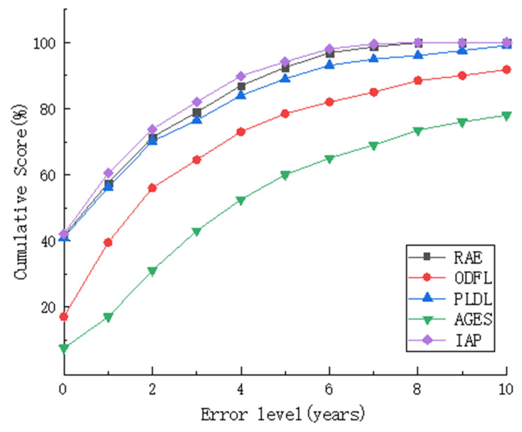 CS represents the accuracy of different error values measured in years, with error levels ranging from 0 to 10, defined as follows:
