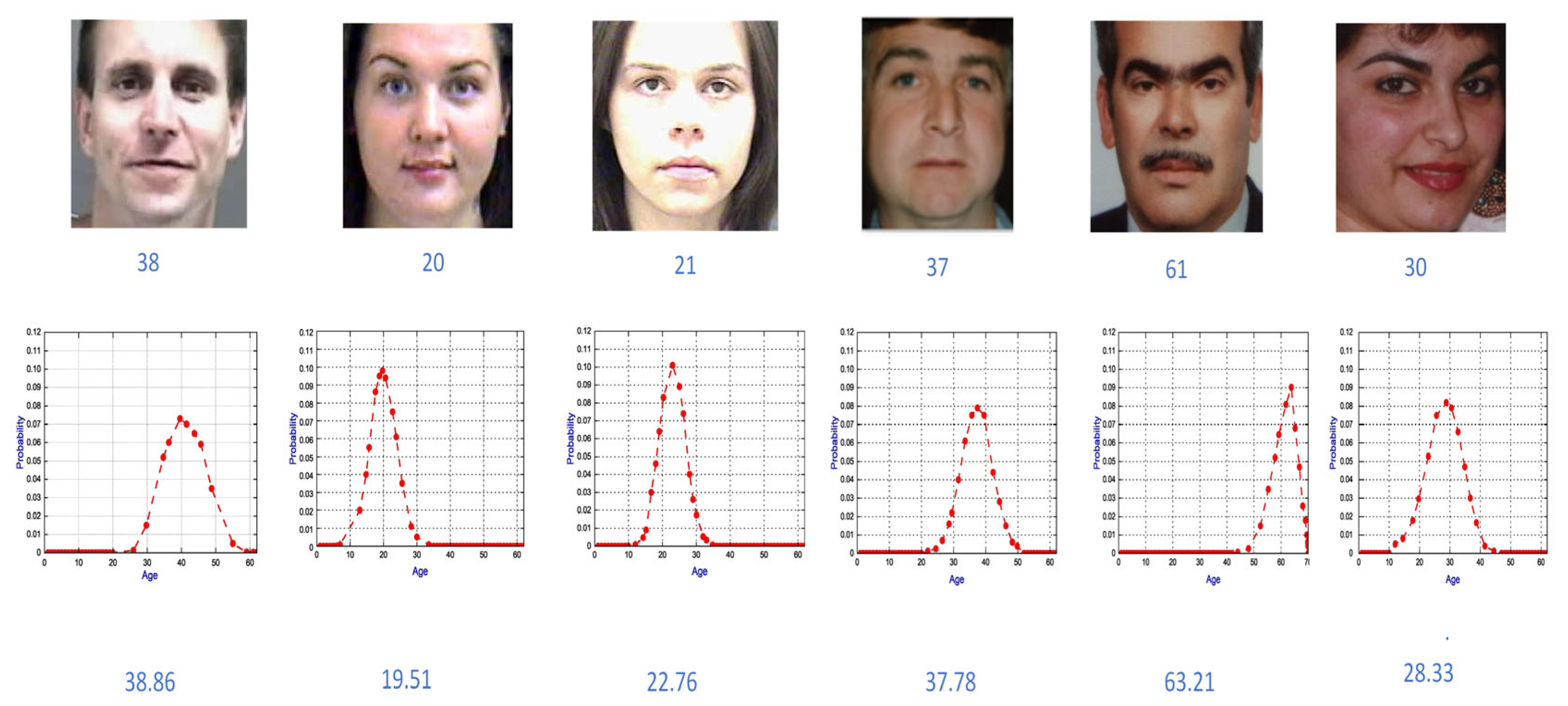 5]. Facial age is no longer a single label but is described by a class probability distribution structure, which indicates the degree of matching between the sample and multiple related ages. Specifically, for a facial image sample