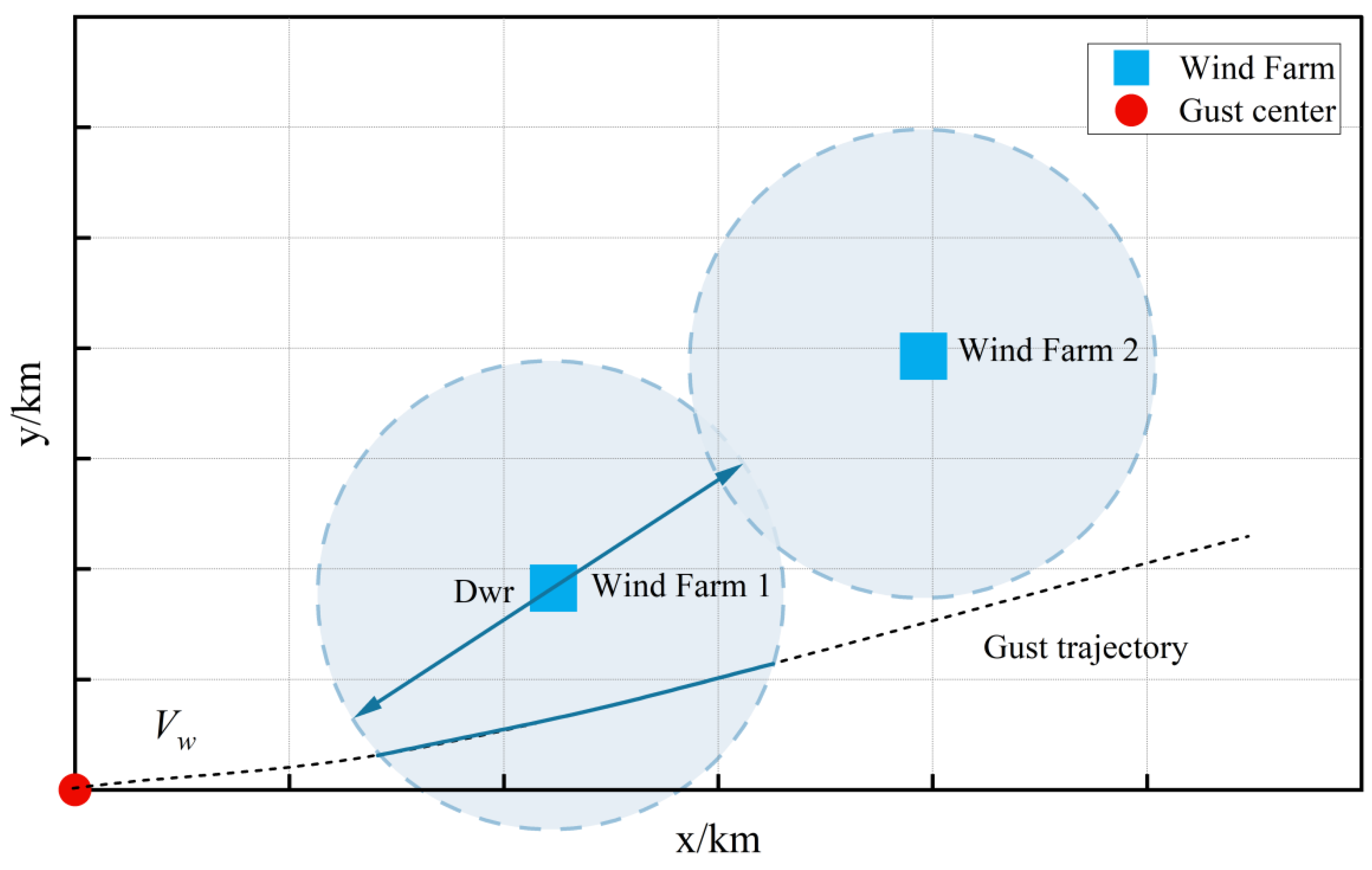 Figure 2 provides a schematic illustration of how the trajectory of an extreme gust event leads to different exposure durations for different wind farms. The gust propagates along the dashed path with a translational velocity V w , and its influence area at each time instant is represented by the moving circular footprint with radius D w r around the gust center. As shown in the figure, the trajectory intersects the influence region of Wind Farm 1 over a longer chord length than that of Wind Farm 2. According to Equation (13), Wind Farm 1 experiences a longer exposure duration, while Wind Farm 2 is exposed for a shorter period.