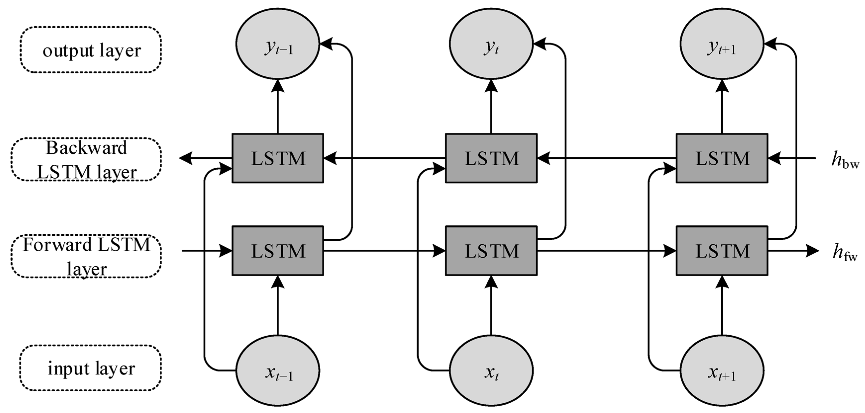 In Equation (15), h t is the state of the forward LSTM hidden layer at time t; h t is the state of the backward LSTM hidden layer at time t; W y represents the weight; b y represents the bias term; x t represents the input data at time t; y t represents the output data at time t.