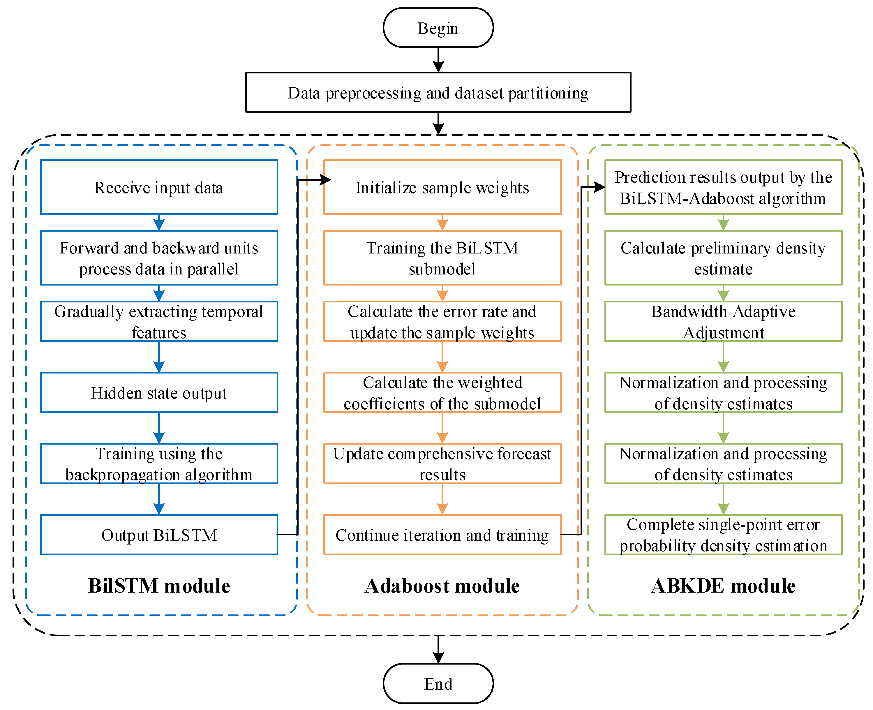 In addition, Yang Tengjie et al. [17] proposed an interpretable model based on NRBO-XGBoost and ABKDE, using ABKDE for error correction and successfully improving tunneling speed prediction accuracy. Kang Yan et al. [18] proposed a flood interval forecasting method based on an error correction fusion model, which successfully improved forecast accuracy by combining error correction with ABKDE. These studies demonstrate that the combination of BiLSTM–AdaBoost and ABKDE has significant advantages in feature extraction and time-series analysis, providing strong theoretical support for this study.