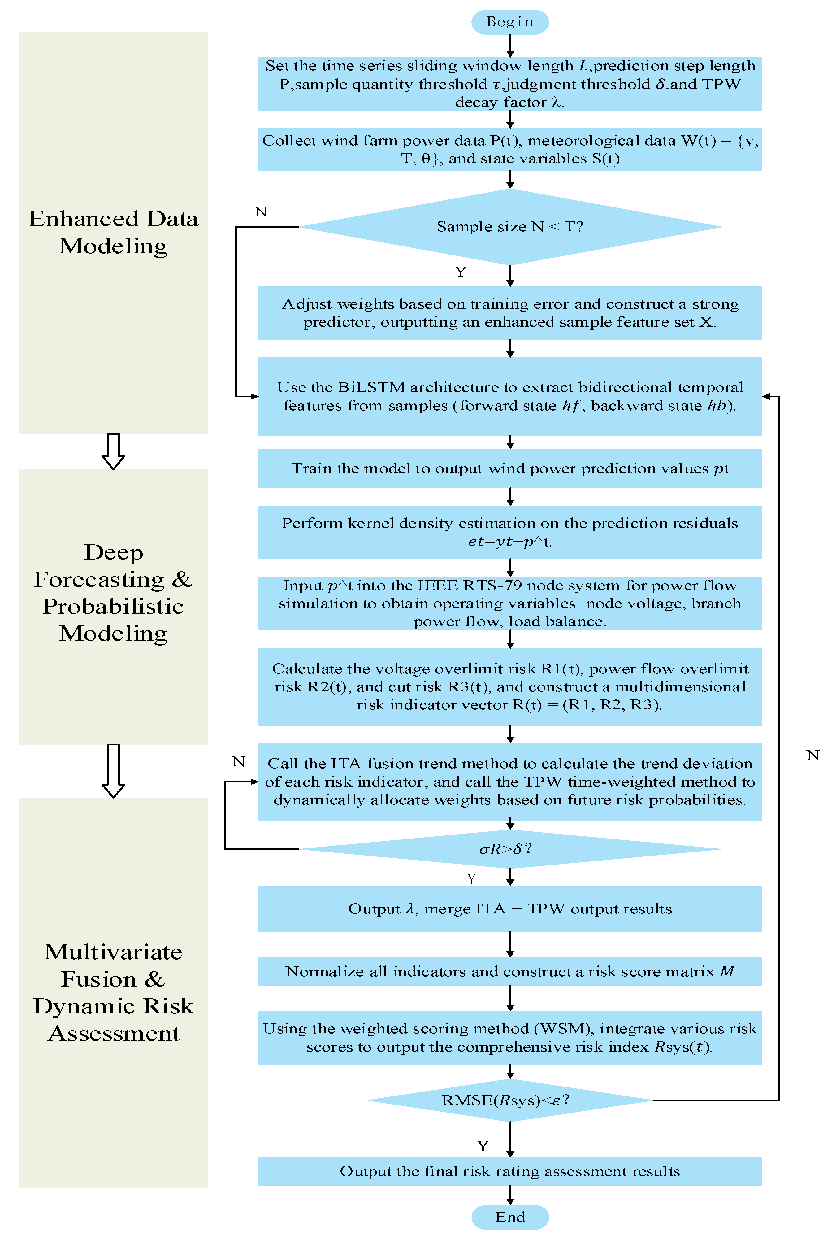 In recent years, modern deep learning technologies such as Generative Adversarial Networks (GAN) and Transformer have been introduced into the fields of extreme weather event prediction and wind power forecasting. For example, in the literature, ref. [19] proposed a hybrid model that combines gust detection with a Conditional LSTM to more accurately forecast wind speed under extreme gust conditions. However, these methods mainly focus on improving wind speed or wind power forecasting performance and do not explicitly consider how real-time wind power disturbances propagate to grid-level operational risks. Similarly, Li Ling et al. [20] proposed a wind farm fault and capacity loss prediction method based on ensemble learning, which provides an important reference for wind power grid integration risk assessment. Nevertheless, most of these approaches are still confined to a single link in the chain and fail to comprehensively cover the full process from “extreme wind speed disturbances” through “wind power forecasting” to “grid operation risk assessment.”