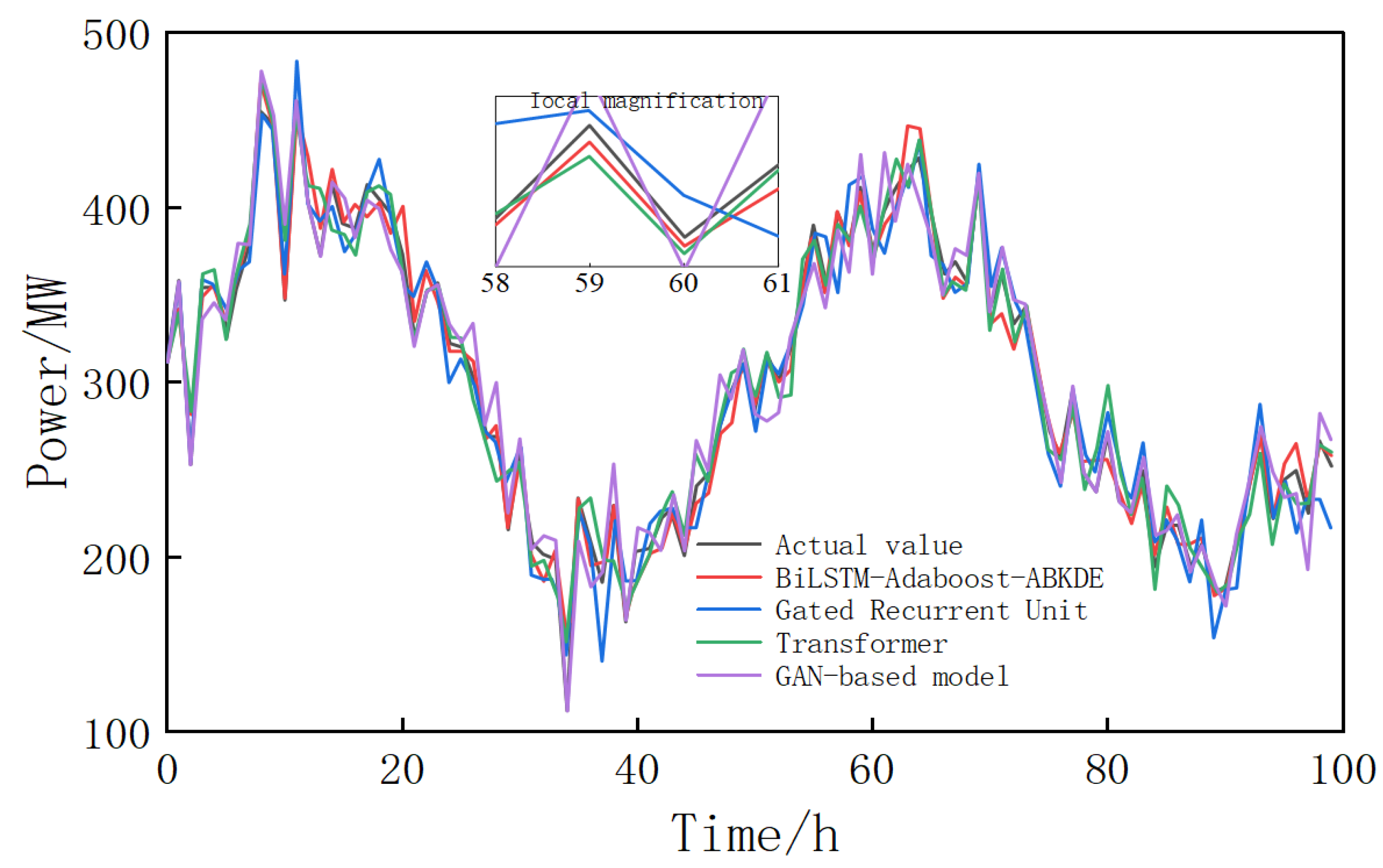 Although models such as Transformer and GAN perform well on large datasets [26], their reliance on large sample sizes and high computational resources limits their application in small-sample and high-noise data scenarios. In contrast, the BiLSTM-Adaboost-ABKDE framework exhibits superior convergence stability and prediction accuracy in small-sample, high-noise wind power data scenarios. Additionally, it effectively quantifies prediction uncertainty, further enhancing grid risk assessment capabilities.