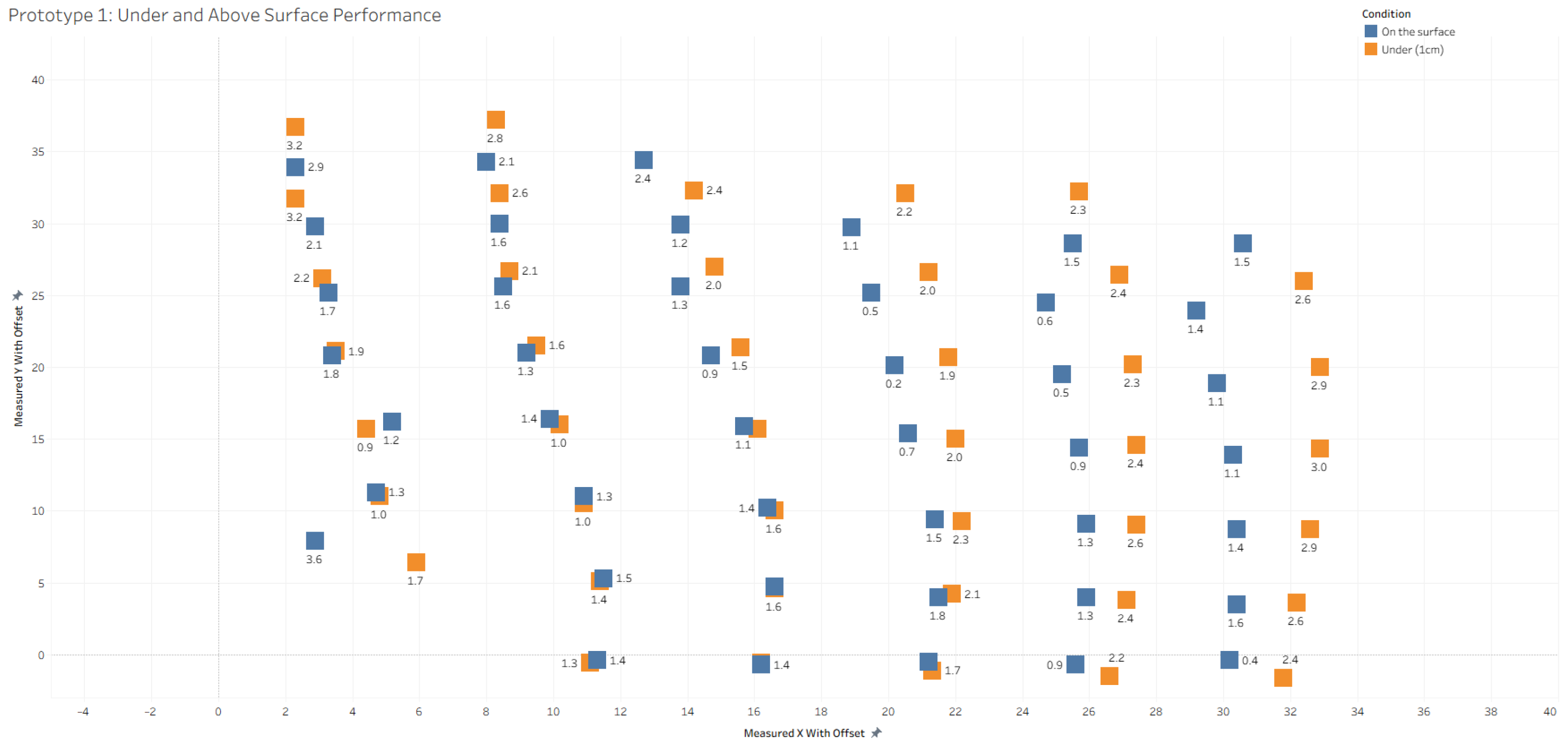 | Minimum operating range | The current prototype operates reliably in a radius of 25 cm, of which the inner ring of 5 cm is not accessible due to sensor saturation and obstruction, leaving an operational area of 1885 cm2. The required surface of an A3 is 1247 cm2. Although the covered surface is larger, it is not rectangular. The requirement is thus partly met. |