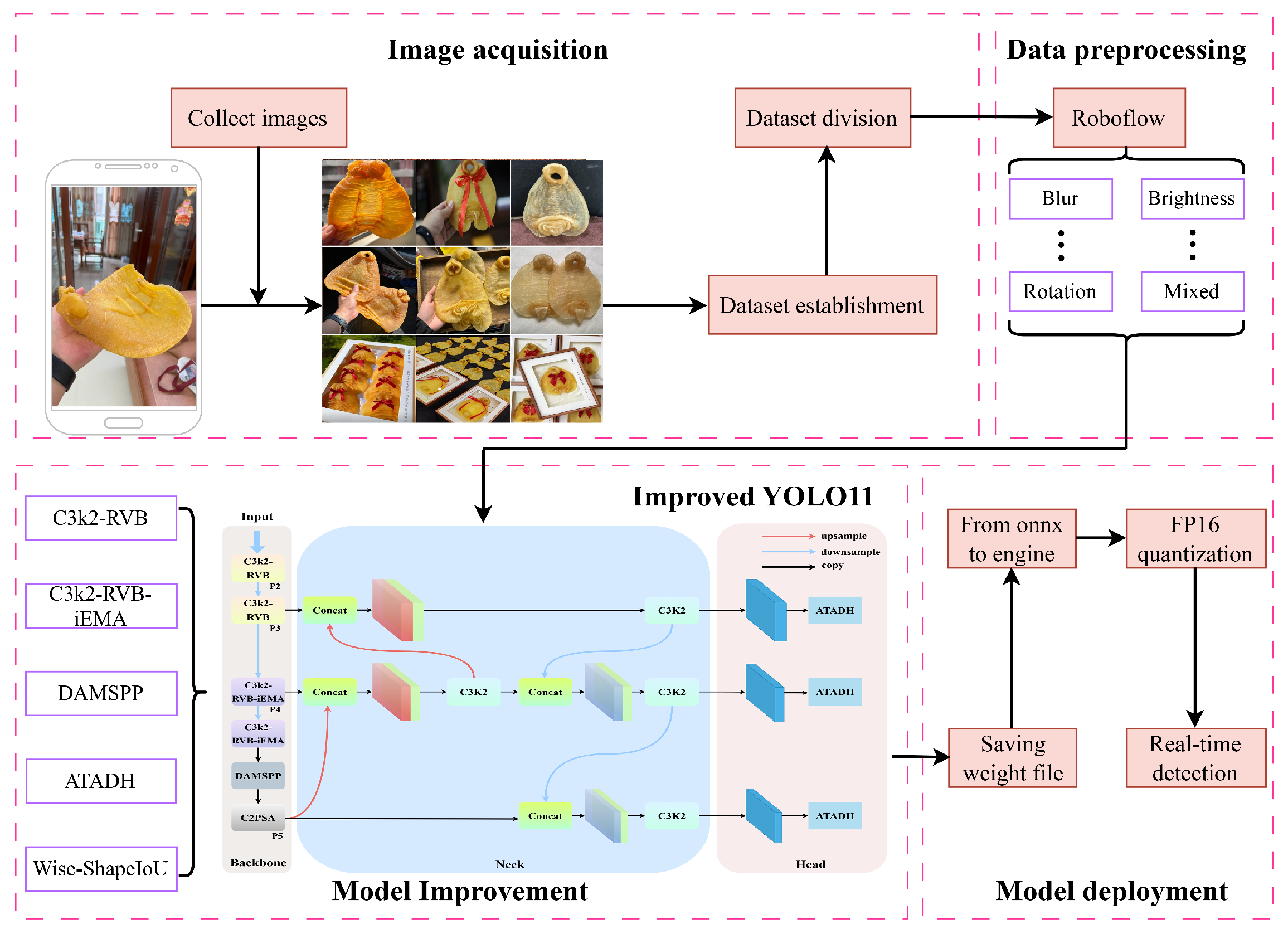 To address these challenges, this study proposes RDT-YOLO, an enhanced YOLO11-based model specifically designed for fish maw authenticity detection. Unlike existing generic object detection models, RDT-YOLO introduces a systematic framework tailored to the unique characteristics of fish maw authentication, including subtle texture differences, significant size variations, and the need for lightweight deployment. The overall framework of this study is illustrated in