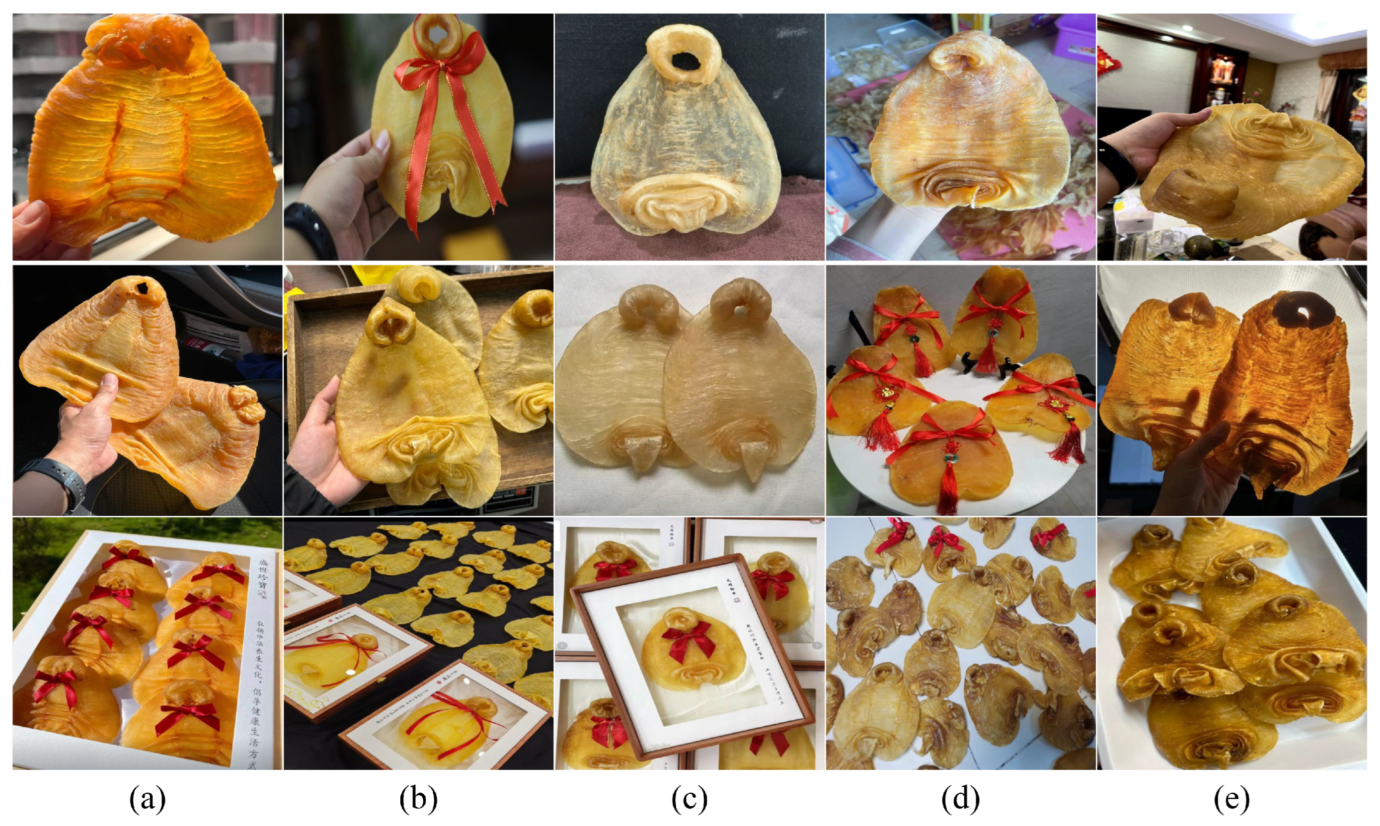 The dataset used in this study was primarily sourced from Shanghao Jiao retail store in Shantou City, Guangdong Province, China and from Jiexun Aquaculture Co., Ltd. in Raoping County, China, employing multi-channel collection methods to enhance representativeness and diversity. The final fish maw dataset encompasses five major categories: Red-mouth fish maw, White croaker fish maw, Annan fish maw, Douhu fish maw, and Duck-tongue shaped maw.