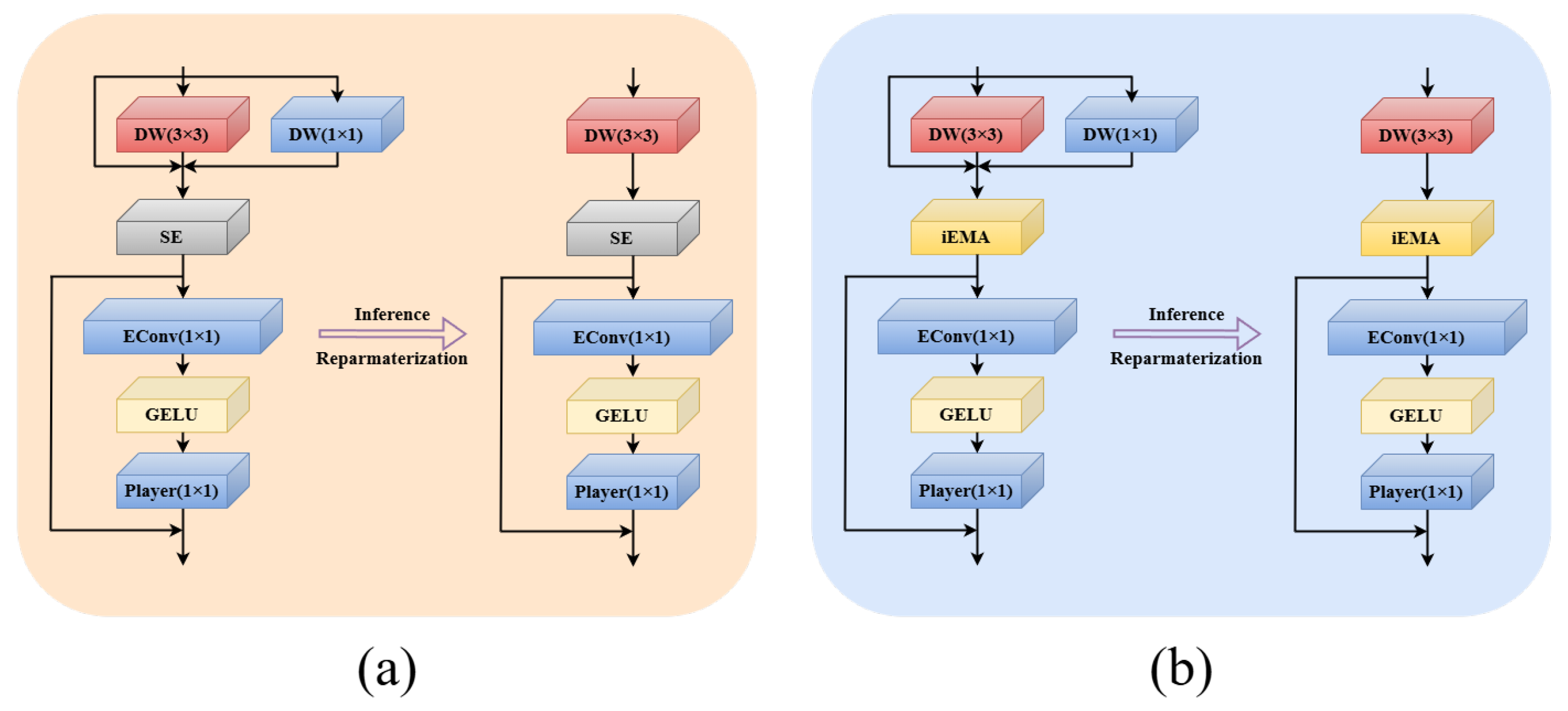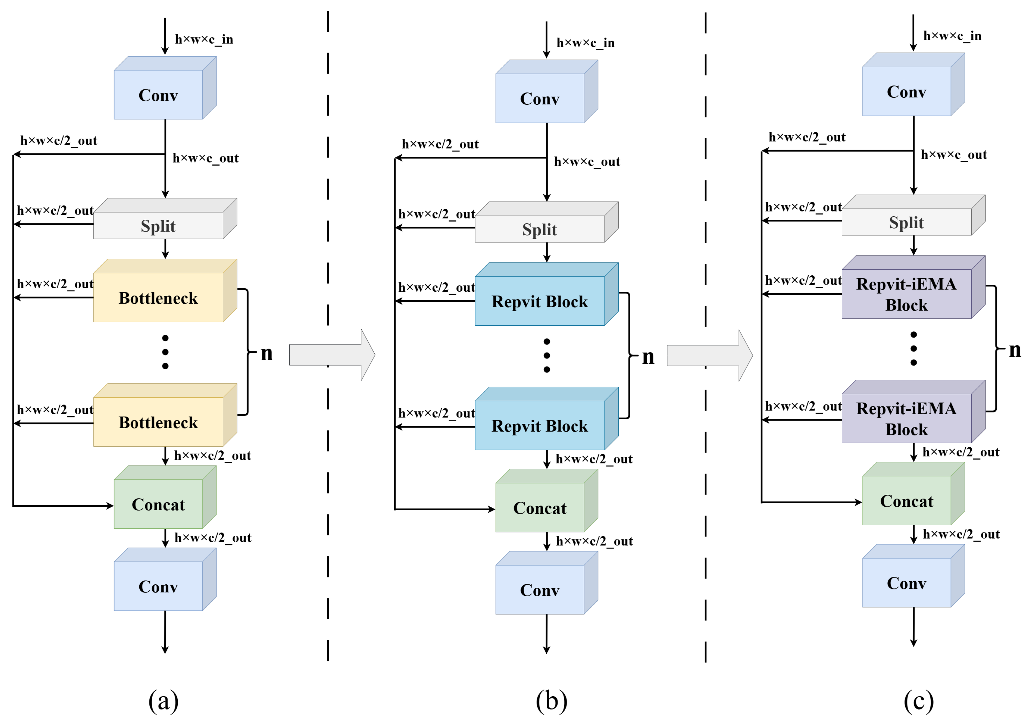Figure 5b, which employs reparameterization to preserve fine-grained details while maintaining efficiency. In the deep layers we develop the C3k2-RVB-iEMA module, shown in
