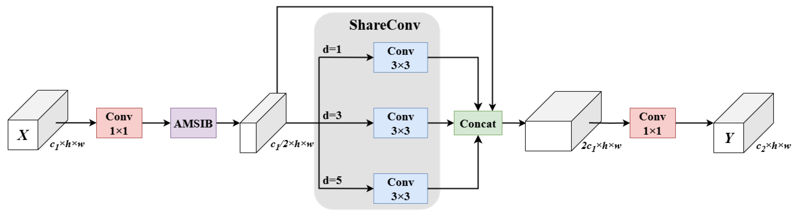 Figure 9. The AMSIB incorporates Adaptive Inception Convolution with Dynamic Kernel Weighting to learn scale-specific importance, which is combined with shared convolution for efficiency. This adaptively captures texture at multiple scales while preserving fine-grained details.