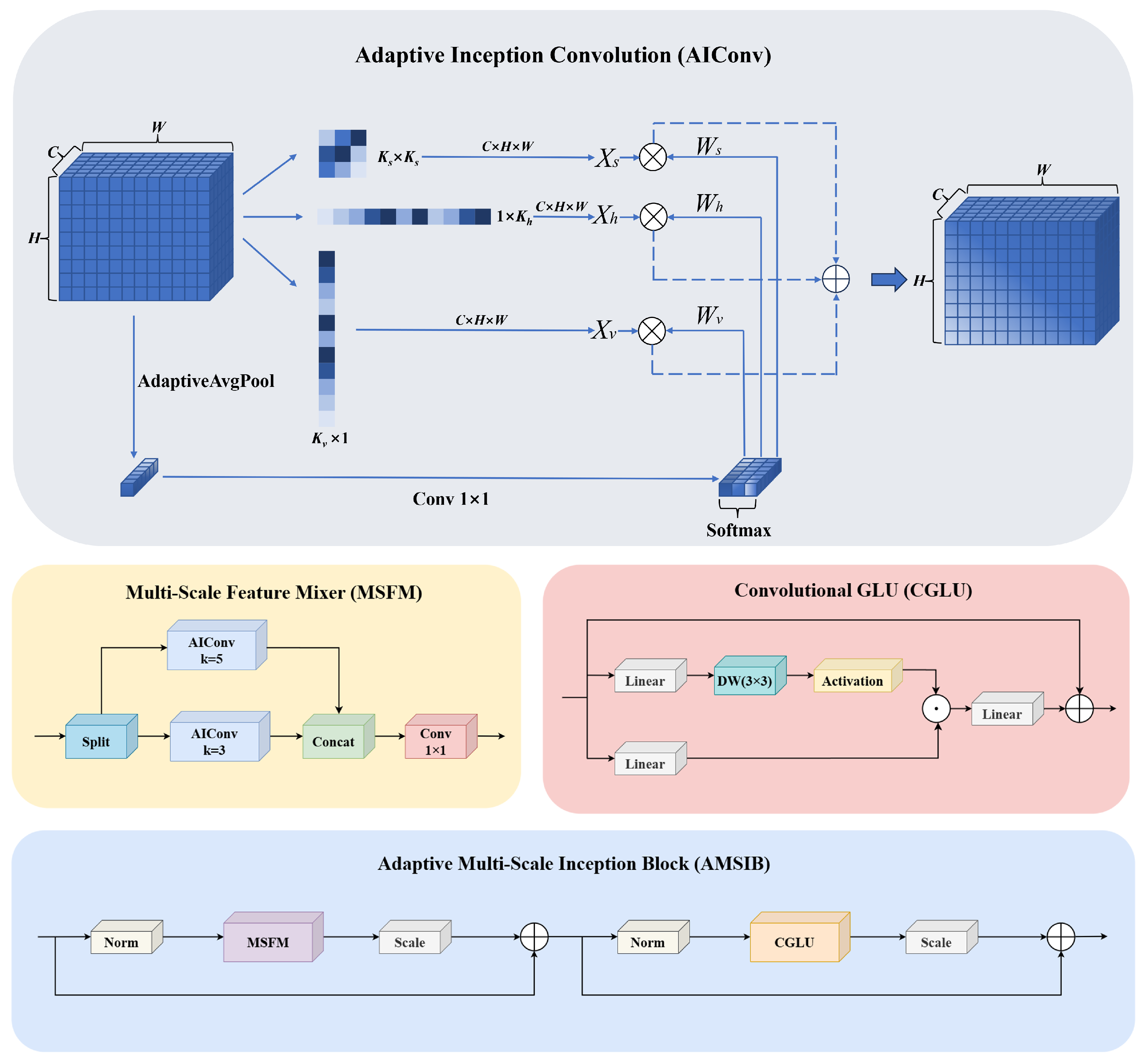 This paper first designs Adaptive Inception Convolution (AIConv), the core of which lies in the use of a Dynamic Kernel Weighting (DKW) mechanism to achieve global adaptive processing of input feature maps.