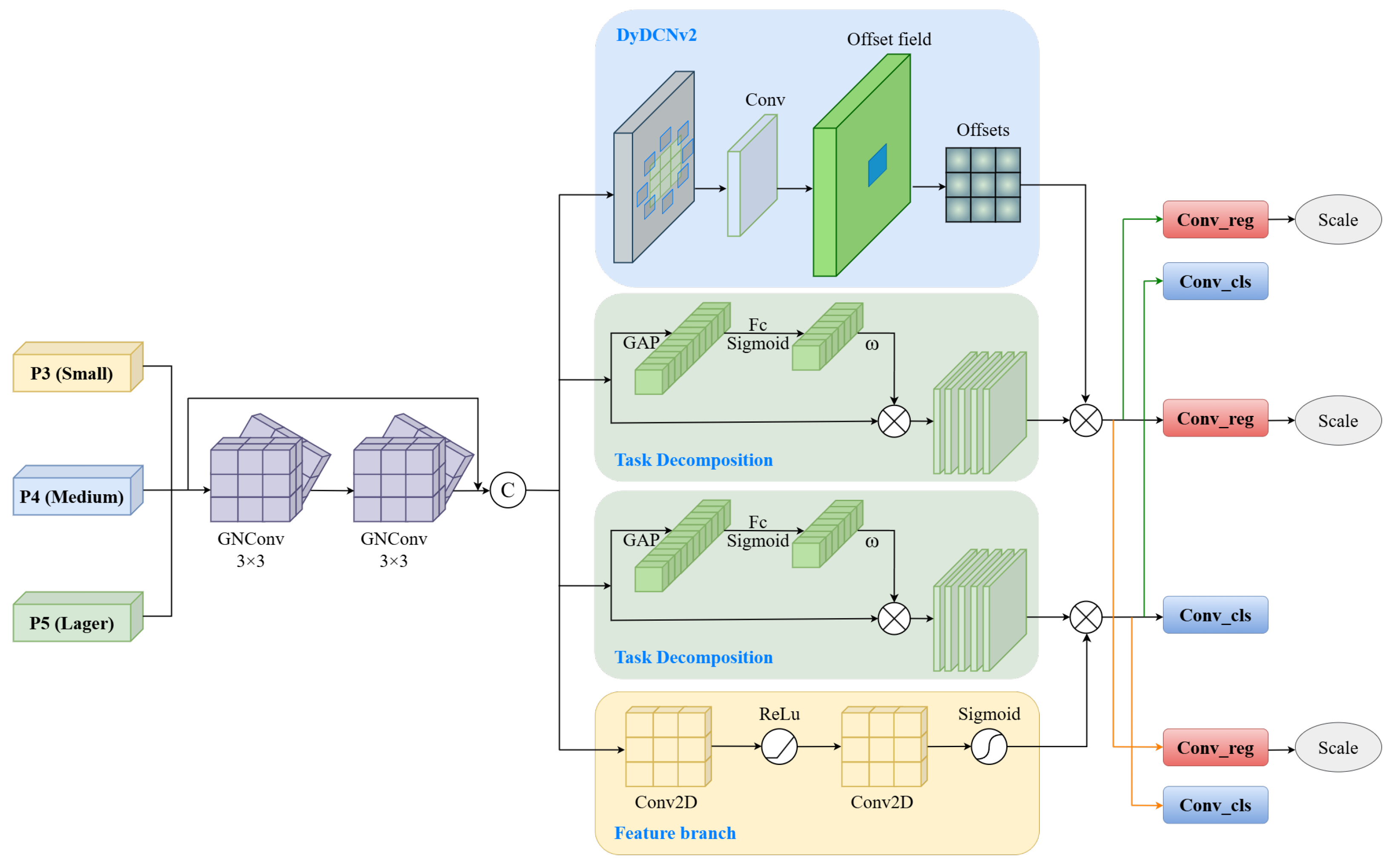 We develop an Adaptive Task-Aligned Detection Head (ATADH), which synergistically combines task decomposition, shared convolution, and DyDCNv2 mechanisms to achieve effective collaboration between classification and localization tasks while maintaining a lightweight architecture.