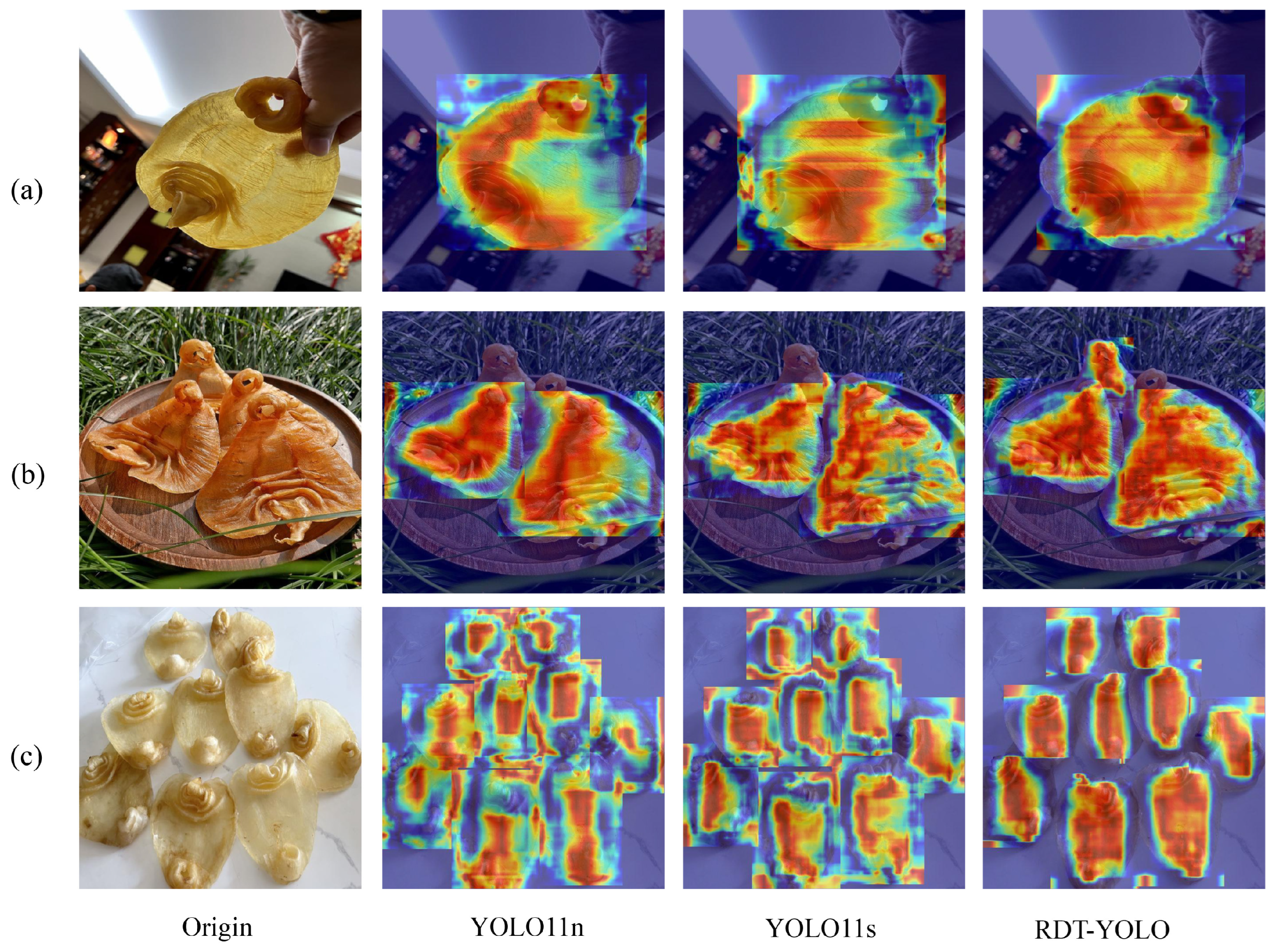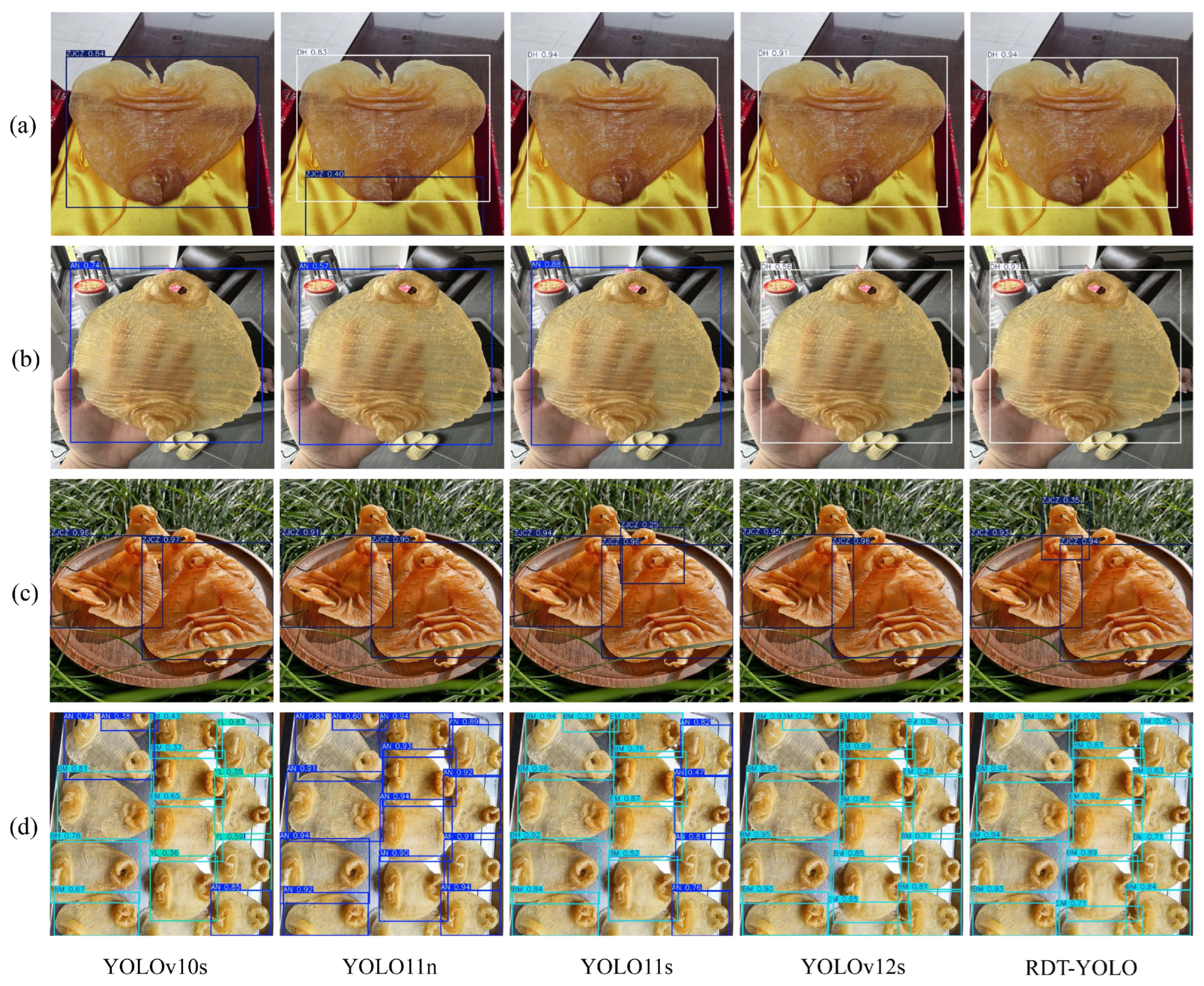 Although RDT-YOLO performs excellently in fish maw authenticity detection tasks, it still has limitations. The current dataset is limited in scale and mainly sourced from specific suppliers and regions, which may introduce sample bias. Fish maw samples with different origins, processing techniques, and storage conditions exhibit subtle differences in appearance characteristics, which may affect model generalization ability. Additionally, although the proposed model demonstrates optimized computational efficiency, further lightweight model compression remains necessary for implementation on edge devices with limited computational resources. The current detection categories are relatively fixed, and the model requires continuous updates and expansion as new counterfeiting methods emerge.