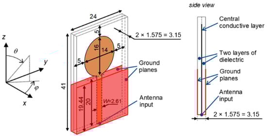 Continuing the considerations contained in [], the same structure of a single antenna was selected as the prototype antenna for the design of two variants of new four-element antenna arrays. The prototype single antenna, as shown in Figure 1, has an ellipsoidal radiator with dimensions 14 mm and 16 mm for the horizontal (y) and vertical axes (z). It presents a good impedance matching throughout the considered operating band of 6.0–8.5 GHz. The radiator is fed by the stripline with a length of 20 mm and a width of 2.61 mm (50 Ω). The center conductor of this line is placed between two layers of ground plane over almost the entire length, which is 19.44 mm. This shortening by 0.56 mm, relative to the point connecting the end of the feeding line with the bottom edge of the radiator, has a beneficial influence on the impedance matching.
