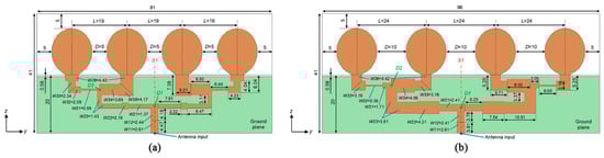 Final structures of designed four-element UWB antenna arrays (yz-plane, dimensions in mm): (a) Shorter version; (b) Longer version.