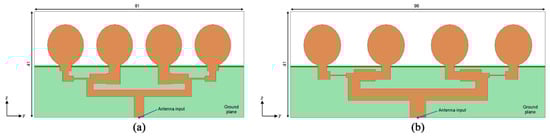 Using the designed prototype single antenna, two versions of the four-element UWB antenna arrays were developed, the final structures of which are shown in Figure 2. The radiators in the designed arrays, originating from the prototype antenna, are arranged in one line on the central conductive layer, along the y-axis, with the same spacing for each variant. The entire structure is composed of two layers. Both dielectric layers have identical parameters as in the prototype antenna. On both outer sides, there are two ground planes with the same height of 19.44 mm but different widths, depending on the antenna array variant.