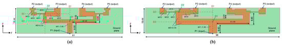 Structures of wideband feeding networks after the first phase of the design (dimensions in mm): (a) Shorter variant; (b) Longer variant.
