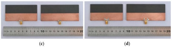 All designed antennas were made by the author using Rogers RT/Duroid 5880 substrate, 1.575 mm thick (for a single layer) and εr = 2.2. SMA-type connectors were used as inputs. The central conducting layer was transferred to one side of the Rogers laminate selected for the project, while on its other side, there is one layer of the ground plane. The opposite ground plane was transferred to the external side of the second layer of the laminate. After assembling the SMA connector, two layers of the laminate were connected. The laminate metallization is 35 µm thick, while in the computer model, a simplification was used, where the thickness of the metallization is 0 µm. Figure 5 shows photos of the middle metallic layers of both arrays’ versions and the manufactured antennas.