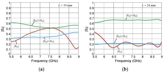 Figure 7a,b present the frequency characteristics of the transmission and reflection coefficients obtained during the first phase of design and optimization. For the network intended for the longer array variant, the resulting characteristics closely approach the initial assumptions. Only |S31| = |S41| deviates marginally (by approximately 0.05) from the target level of 0.7, a deviation considered satisfactory for the subsequent design phase.