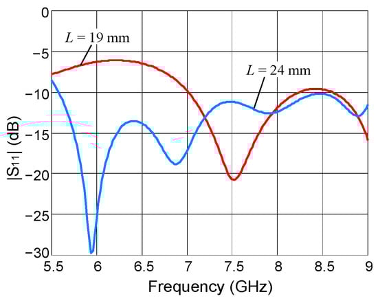 The physical layouts of the arrays entering Phase 2 are presented in Figure 3. Figure 8 shows the simulated |S11| characteristics of both array variants before the second phase of optimization. At this intermediate stage, only the longer variant exhibited satisfactory impedance matching.