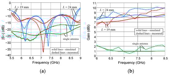 All final dimensions of both antenna array variants were obtained as a result of a multi-iterative optimization process of the array’s geometry, as well as the optimization process of the feeding section. The optimization criterion was to achieve |S11| below −10 dB in the entire frequency band 6.0–8.5 GHz, while the SLL and the overall shape of the radiation pattern were monitored for the final structures obtained during subsequent optimizing iterations.