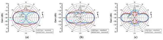 The deviation between simulated and measured SLL and gain values is also attributed to connector reflections not modeled in simulation, real metallization thickness of 35 µm, and slight shifts in the dielectric constant of the substrate. Additionally, the finite dynamic range of the measurement setup may lead to underestimation of deep sidelobe levels. It can be observed that the difference between the simulated and measured gain slightly increases with frequency. The accuracy of the numerical calculations may decrease at higher frequencies because a uniform mesh was used for all analyzed frequencies, which slightly reduces computational precision. Another significant source of discrepancy appears to be measurement-related errors in the radiation pattern characterization. However, it is difficult to quantitatively assess the measurement uncertainty, which may stem from calibration inaccuracies or the mechanical mounting method of the antennas using a rigid coaxial cable. An additional factor is that all antenna prototypes were manually fabricated by the author. Nevertheless, particular care was taken during the alignment of the laminate layers and the soldering of the connector. Overall, the observed deviations are consistent with standard measurement uncertainties.