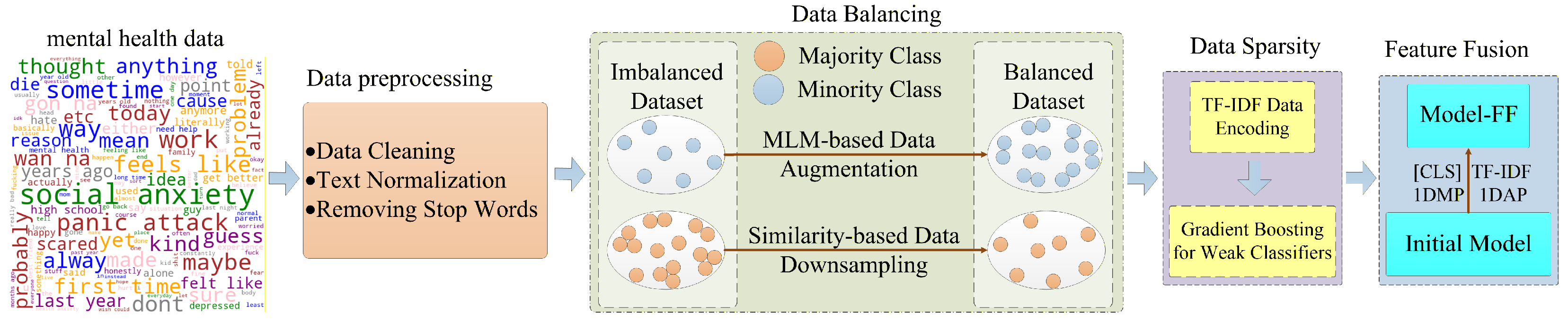 3]. Nonetheless, research focusing on the application of these models for mental health analysis remains relatively nascent, particularly in the accurate identification and prediction of users’ mental health statuses. Data annotation in this domain is inherently complex, labor-intensive, and costly. Moreover, machine learning models in this field often grapple with challenges such as insufficient data and class imbalance, which significantly constrain their performance and overall effectiveness.